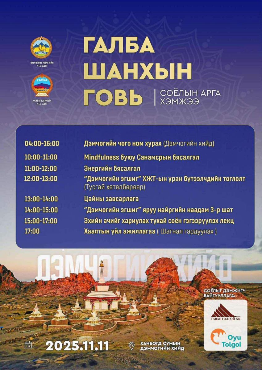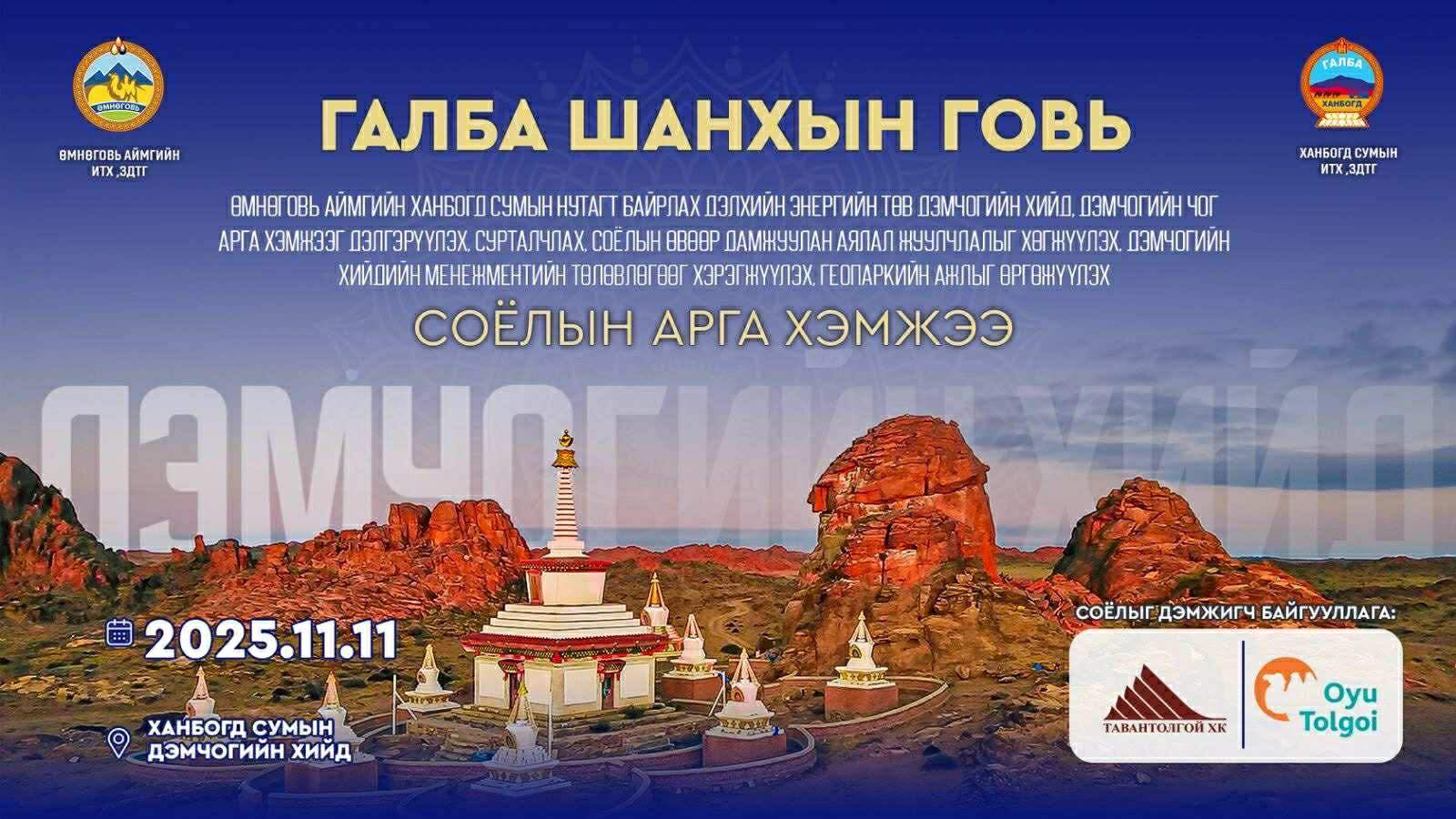 Өмнөговь аймгийн Ханбогд сумын нутагт байрлах Дэлхийн энергийн төв Дэмчогийн хийд болон “Дэмчогийн Чог” арга хэмжээг дэлгэрүүлэх, сурталчлах, соёлын өвөөр дамжуулан аялал жуулчлалыг хөгжүүлэх, мөн Дэмчогийн хийдийн менежментийн төлөвлөгөөг хэрэгжүүлэх, геопаркийн үйл ажиллагааг өргөжүүлэх зорилгоор 2025 оны арваннэгдүгээр сарын 11-ний өдөр Ханбогд сумын Дэмчогийн хийдэд “ГАЛБА ШАНХЫН ГОВЬ” соёлын арга хэмжээ зохион байгуулагдана.