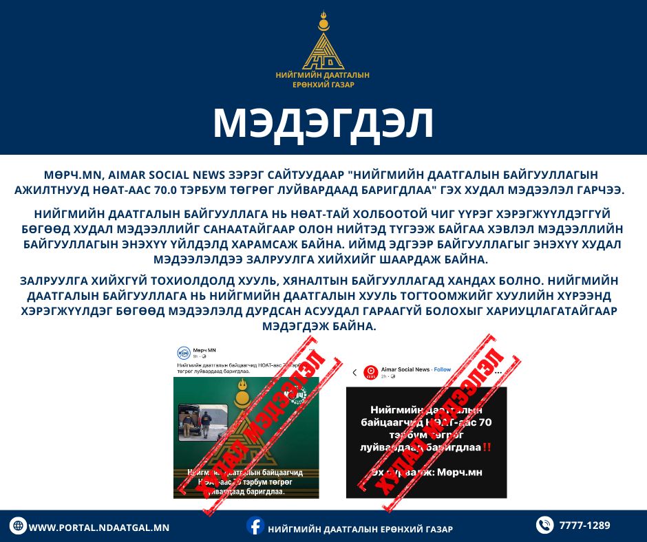Уг мэдэгдэлд "Мөрч MN, Aimar Social News зэрэг сайтуудаар "Нийгмийн даатгалын байгууллагын ажилтнууд НӨАТ-аас 70.0 тэрбум төгрөг луйвардаад баригдлаа" гэх худал мэдээлэл гарчээ.
