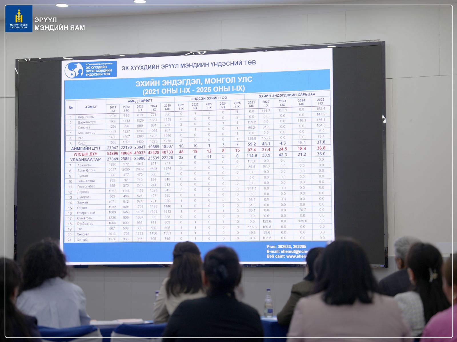 ЭМЯ-ны Сувилахуйн тусламж, үйлчилгээний хэлтсийн дарга Б.Эрдэнэцэцэг:  “Эх баригчийг хөгжүүлэх арга хэмжээний төлөвлөгөө 2025-2028”-ыг хэрэгжүүлэх Эрүүл мэндийн сайдын 2025 оны A/264 дугаар тушаал нь 2025 оны 07 дугаар сарын 09-ны өдөр батлагдсан. Уг төлөвлөгөөг боловсруулахад эх барихын салбарын бүх мэргэжилтэн, амаржих газруудын төлөөлөл оролцсон гэдгийг тодотгоод уг төлөвлөгөөний хүрээнд хэрэгжүүлэх ажлуудаас танилцуулав. Үүнд: