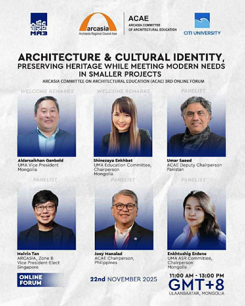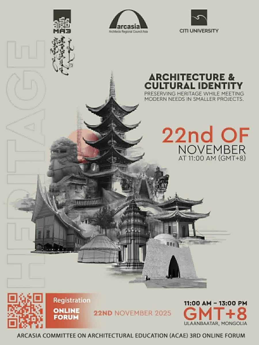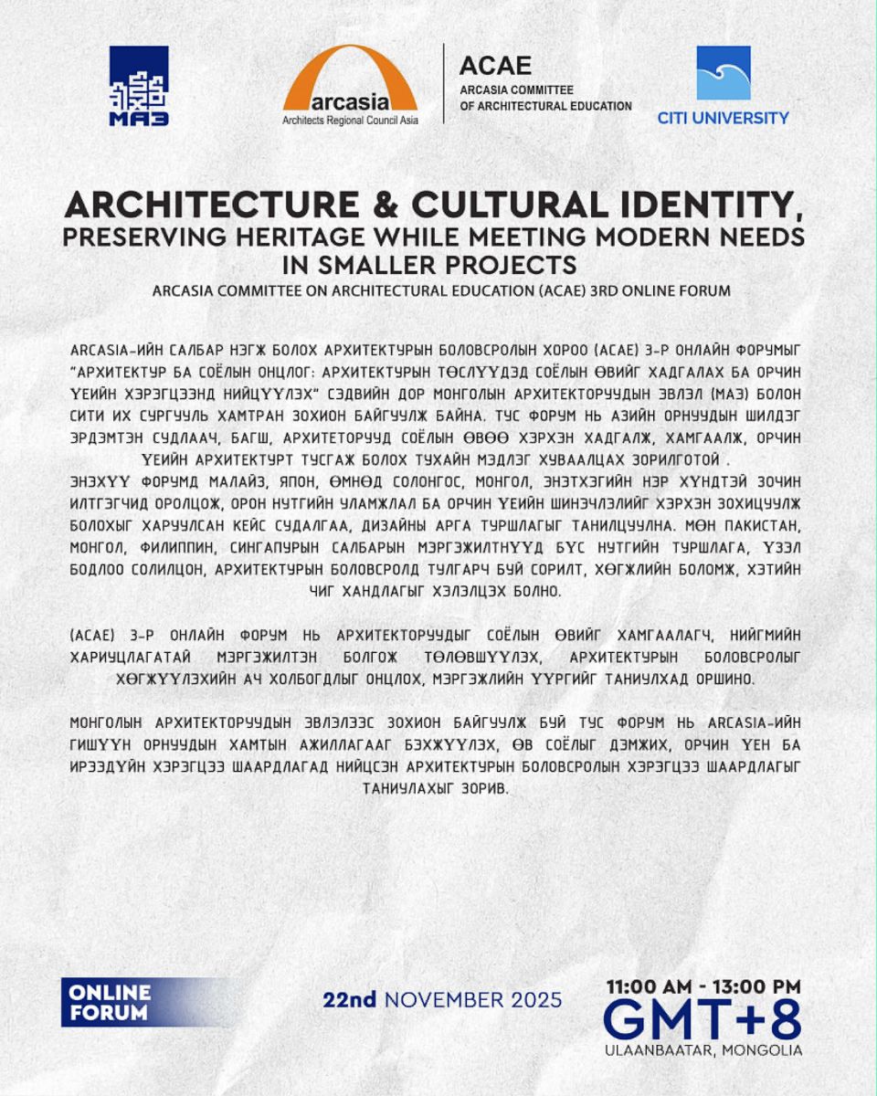 ARCASIA-ийн Архитектурын Боловсролын Хороо (ACAE) энэ сарын 22-ны өдөр 11:00–13:00 цагт гурав дахь онлайн форумаа “Архитектур ба Соёлын Өв” сэдвээр зохион байгуулах гэж байна.
