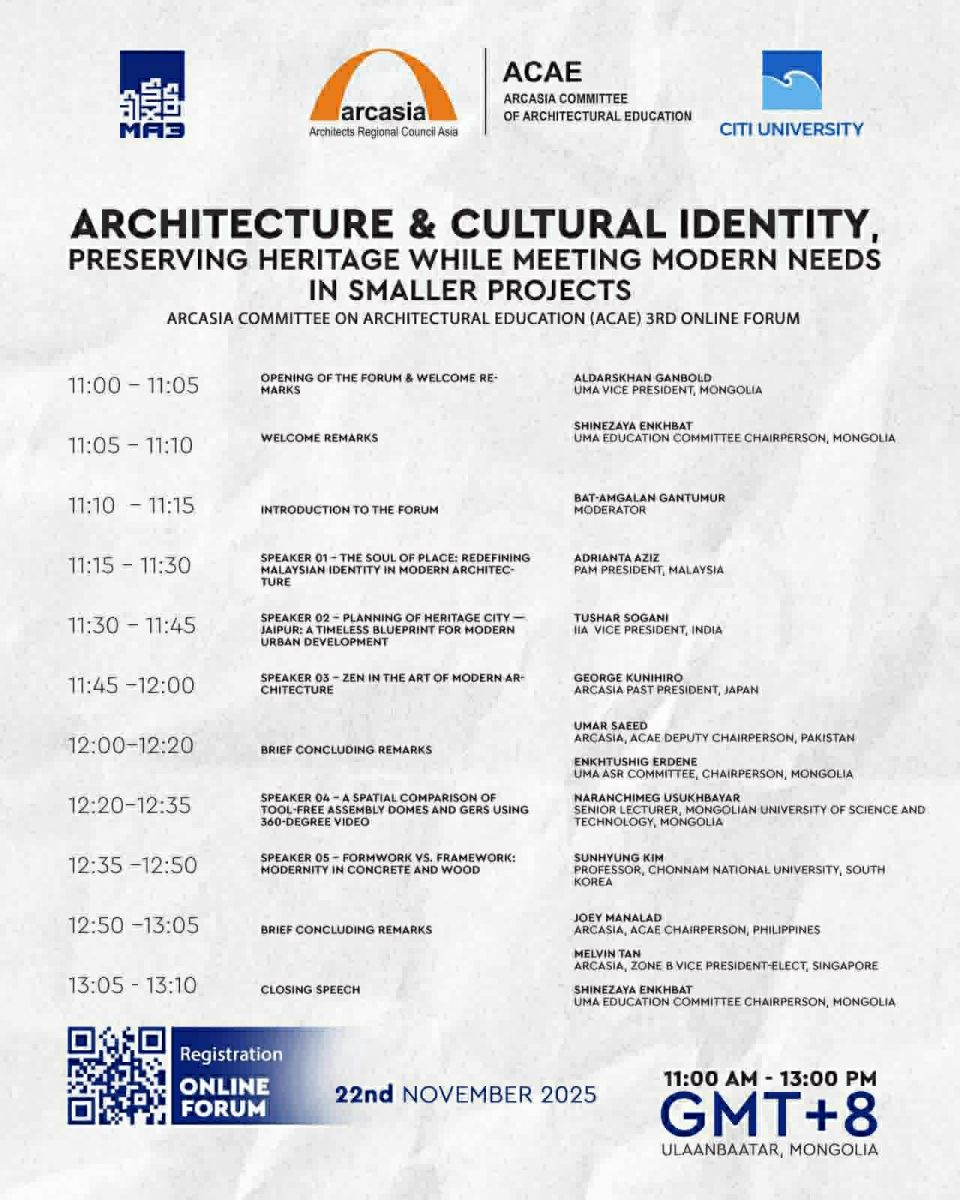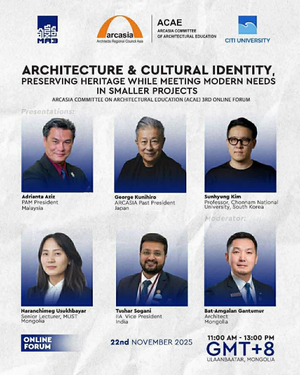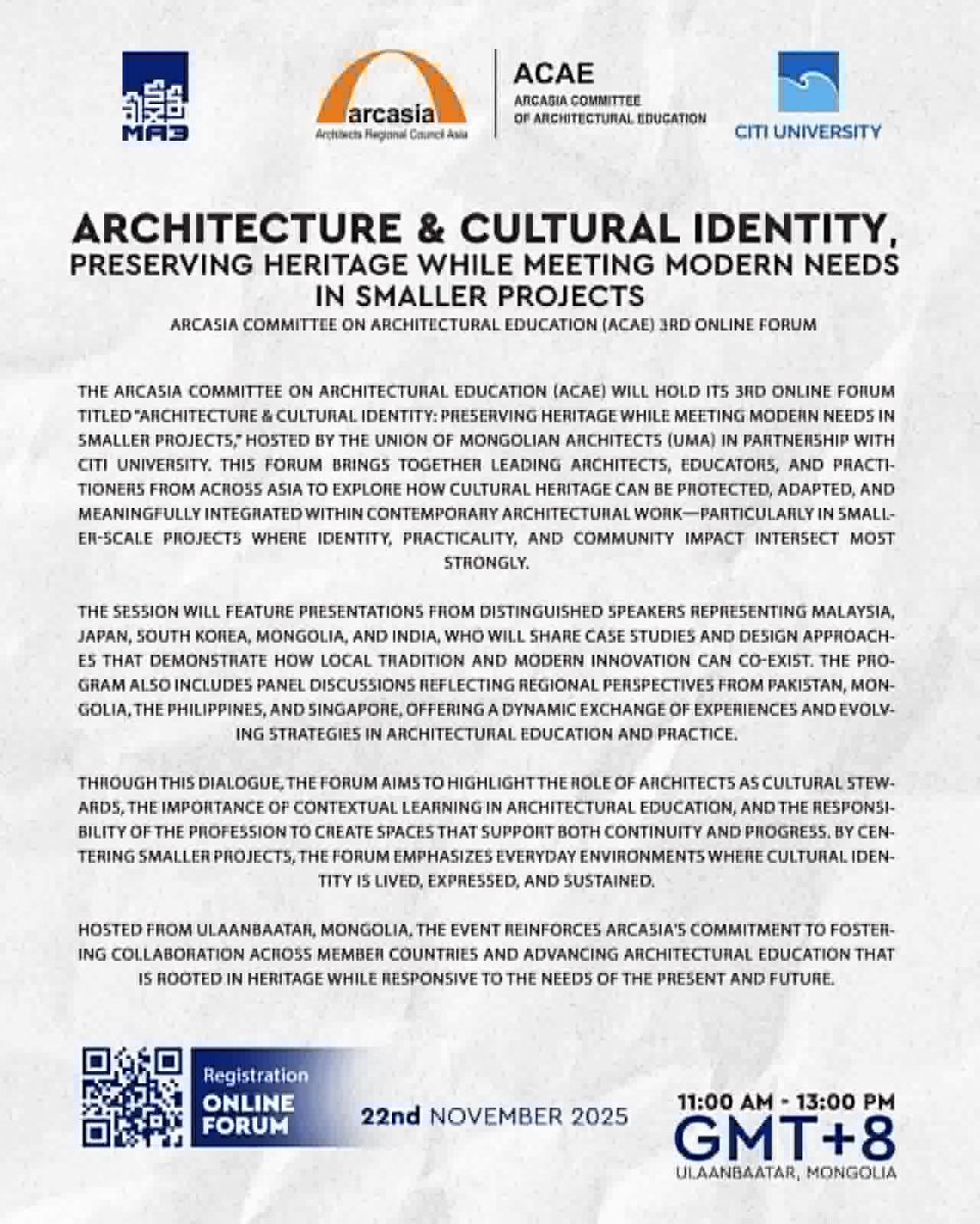 ARCASIA-ийн Архитектурын Боловсролын Хороо (ACAE) энэ сарын 22-ны өдөр 11:00–13:00 цагт гурав дахь онлайн форумаа “Архитектур ба Соёлын Өв” сэдвээр зохион байгуулах гэж байна.