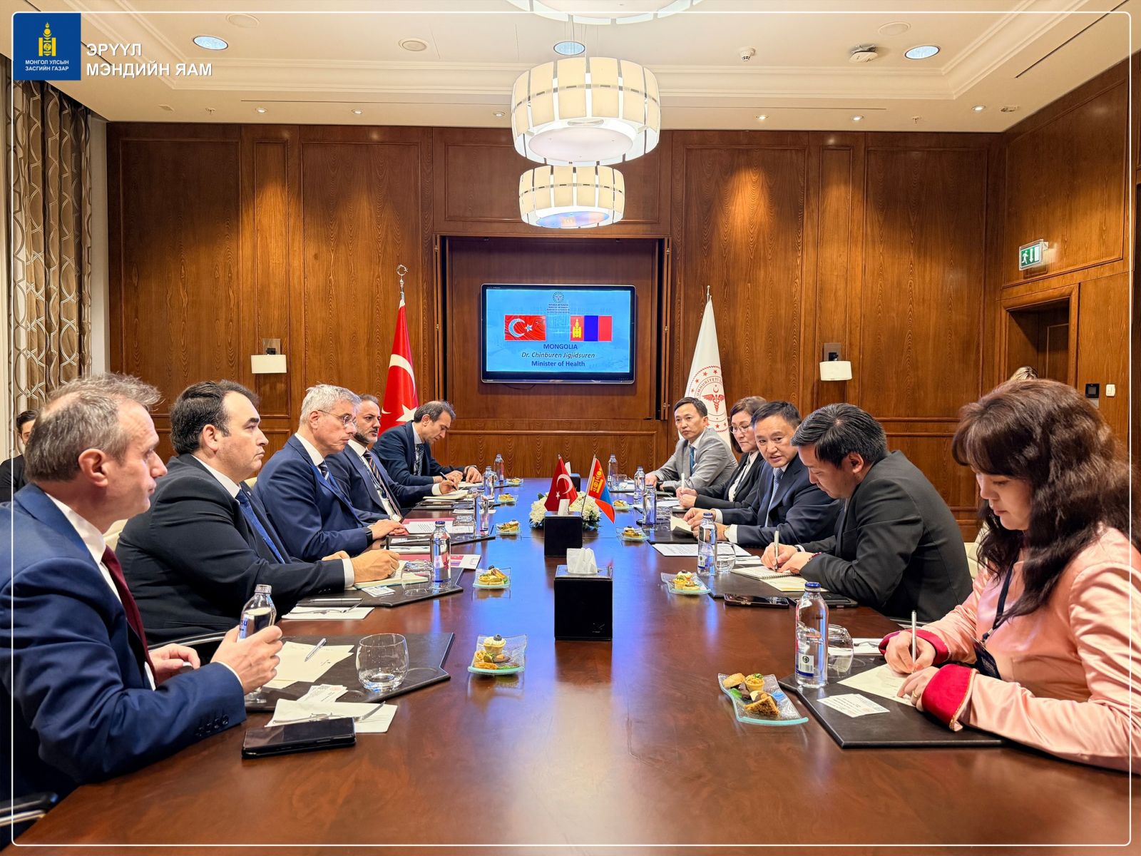 Бүгд Найрамдах Турк Улсын Эрүүл мэндийн сайд Кемал Мемишоглугийн урилгаар Эрүүл мэндийн сайд Ж.Чинбүрэн тус улсад 2025 оны 11 дүгээр сарын 24-26-ны өдрүүдэд ажлын айлчлал хийв. Айлчлалын үеэр Сайд Ж.Чинбүрэн БНТУ-ын Эрүүл мэндийн сайд Кемал Мемишоглутай хоёр талын албан ёсны уулзалт хийж, хоёр улсын Засгийн газар хоорондын эрүүл мэндийн салбарын хамтын ажиллагааг шинэ шатанд гаргах талаар ярилцав. Тухайлбал, 2025 оны 9 дүгээр сард Монгол Улсад хэрэгжсэн БНТУ-ын Эрүүл мэндийн сайдын айлчлалын хүрээнд тохиролцсон санаачилгуудыг бодит ажил хэрэг болгох, өндөр чанартай эм, эмнэлгийн хэрэгсэл нийлүүлэх хамтын ажиллагааг өргөжүүлэх, шинээр байгуулагдах Хавдар судлалын үндэсний төвийн эмч мэргэжилтнүүдийн сургалт, хүний нөөцийн чадавхыг бэхжүүлэх зэрэг асуудлын хүрээнд тодорхой ажлуудыг хэрэгжүүлэхээр тохиролцов. Тухайлбал, монголын талаас эмч, сувилагчдыг Турк Улсад шат дараатайгаар сургах, эхний ээлжинд өрх, сумын эрүүл мэндийн төвийн ажилтнуудыг хамруулахаар болов.