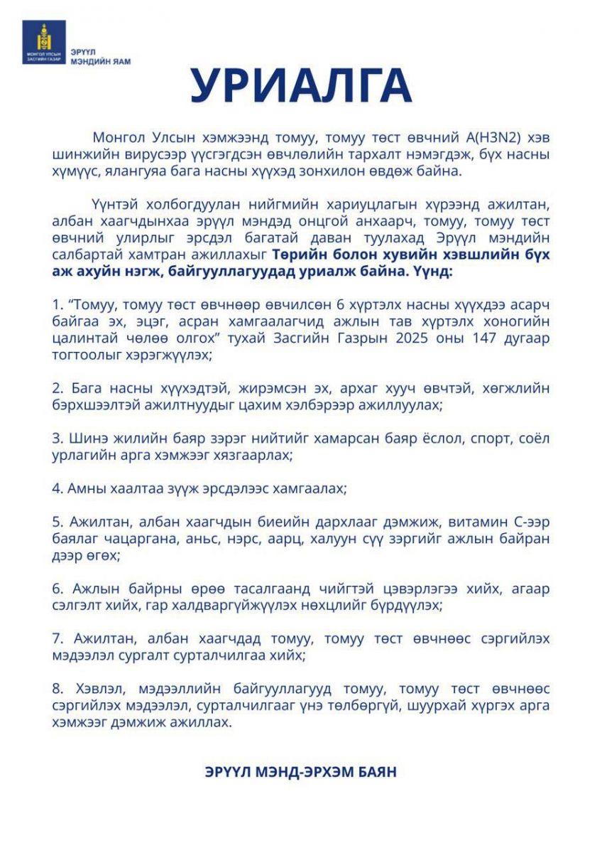 Эрүүл мэндийн яамнаас томуу, томуу төст өвчний улирлыг эрсдэл багатай даван туулахад төрийн болон хувийн хэвшлийн бүх аж ахуйн нэгж, байгууллагуудад хамтран ажиллах дараах уриалгыг дэвшүүлжээ.