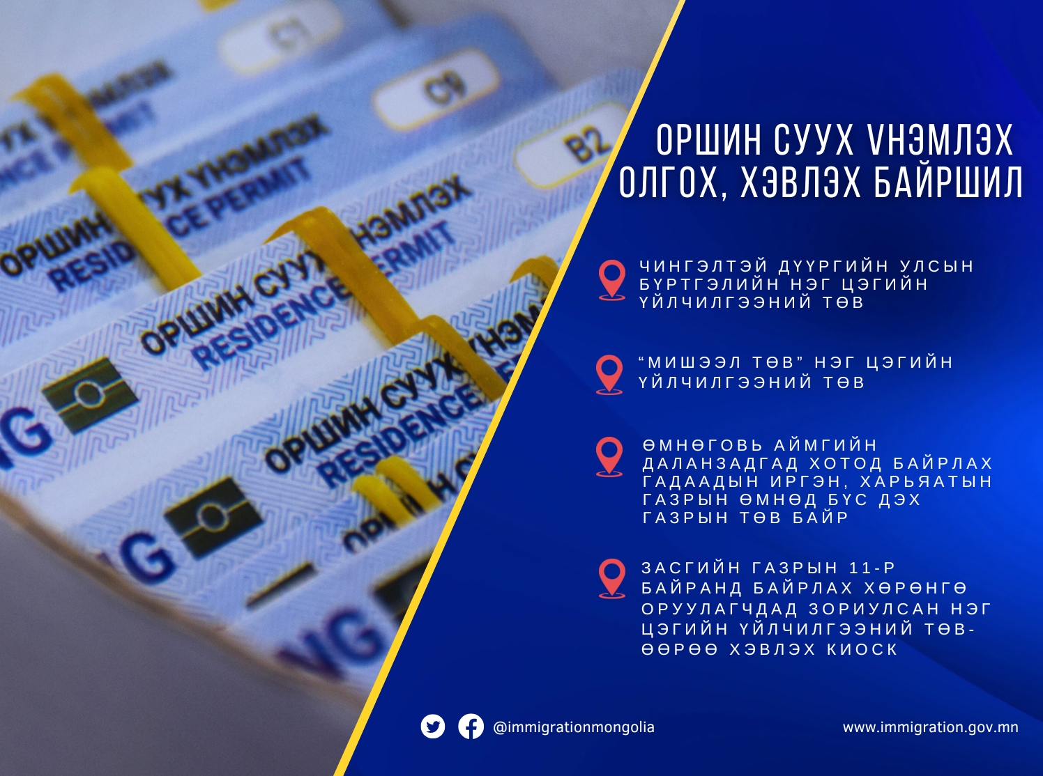 Уригч иргэн, аж ахуйн нэгж байгууллагууд үйлчилгээний цахим системээр гадаадын иргэний оршин суух зөвшөөрөл шинээр авах, сунгах, хэлбэр, төрөл, уригч өөрчлөх, үнэмлэх дахин авах хүсэлт гаргахдаа Чингэлтэй дүүргийн Улсын бүртгэлийн нэг цэг, “Мишээл төв” нэг цэг, Өмнөд бүс дэх газар болон өөрөө хэвлэх киоск машин сонголтуудаас өөрт ойр байрлах цэгийг сонгон үйлчлүүлэх боломжтой юм.