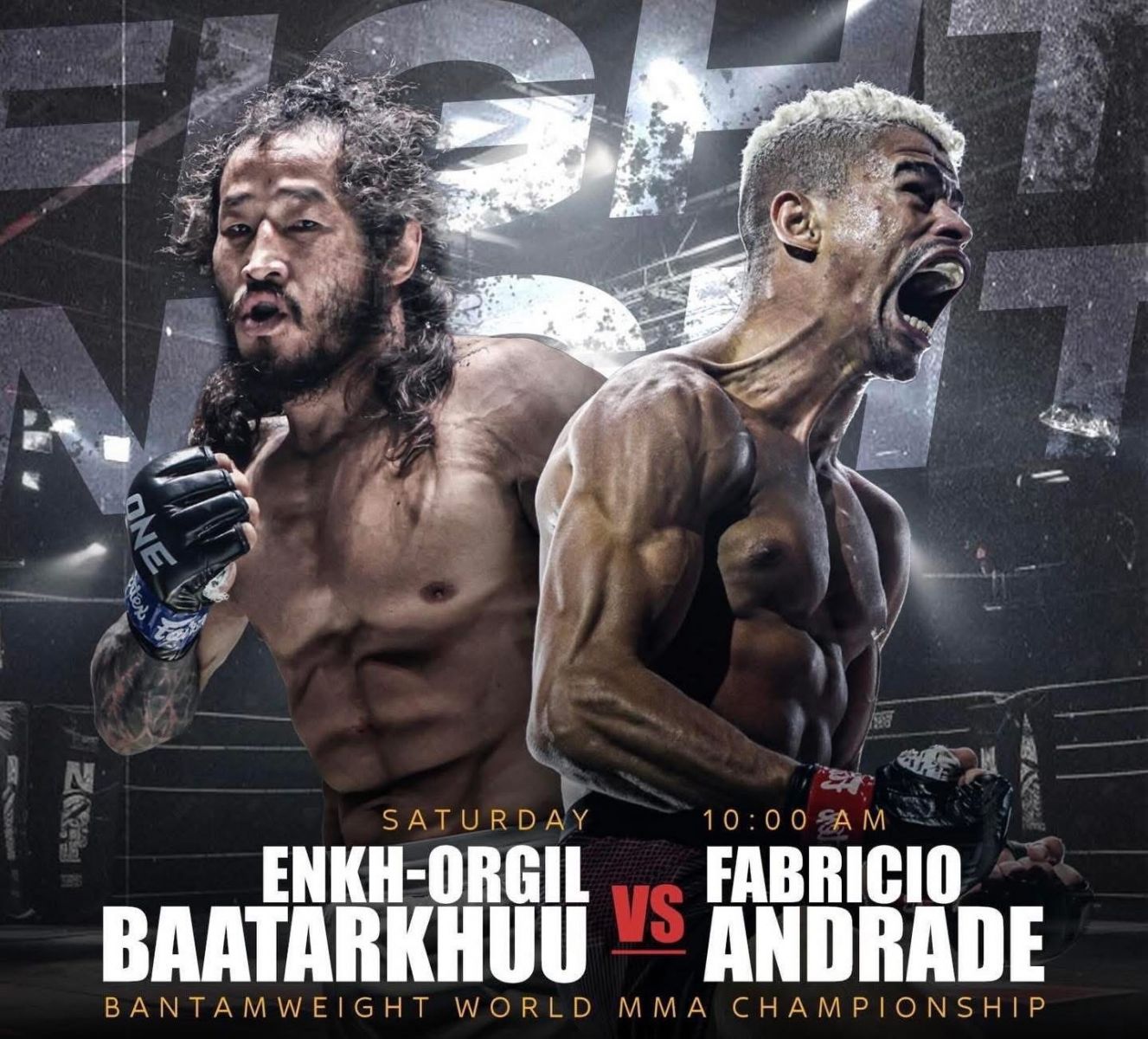 Холимог тулааны “One Fight Night-38” тэмцээний оргил тулаанд Монголын тамирчин Баатархүүгийн Энх-Оргил Вразил улсын тамирчин дэлхийн аваргын бүсний эзэн Фабрисио Де Андрадетай 65.8 кг-ын жингийн дэлхийн аваргын бүсний төлөө тулалдаж, дөрөвдүгээр үед боолтоор ялалт байгууллаа.