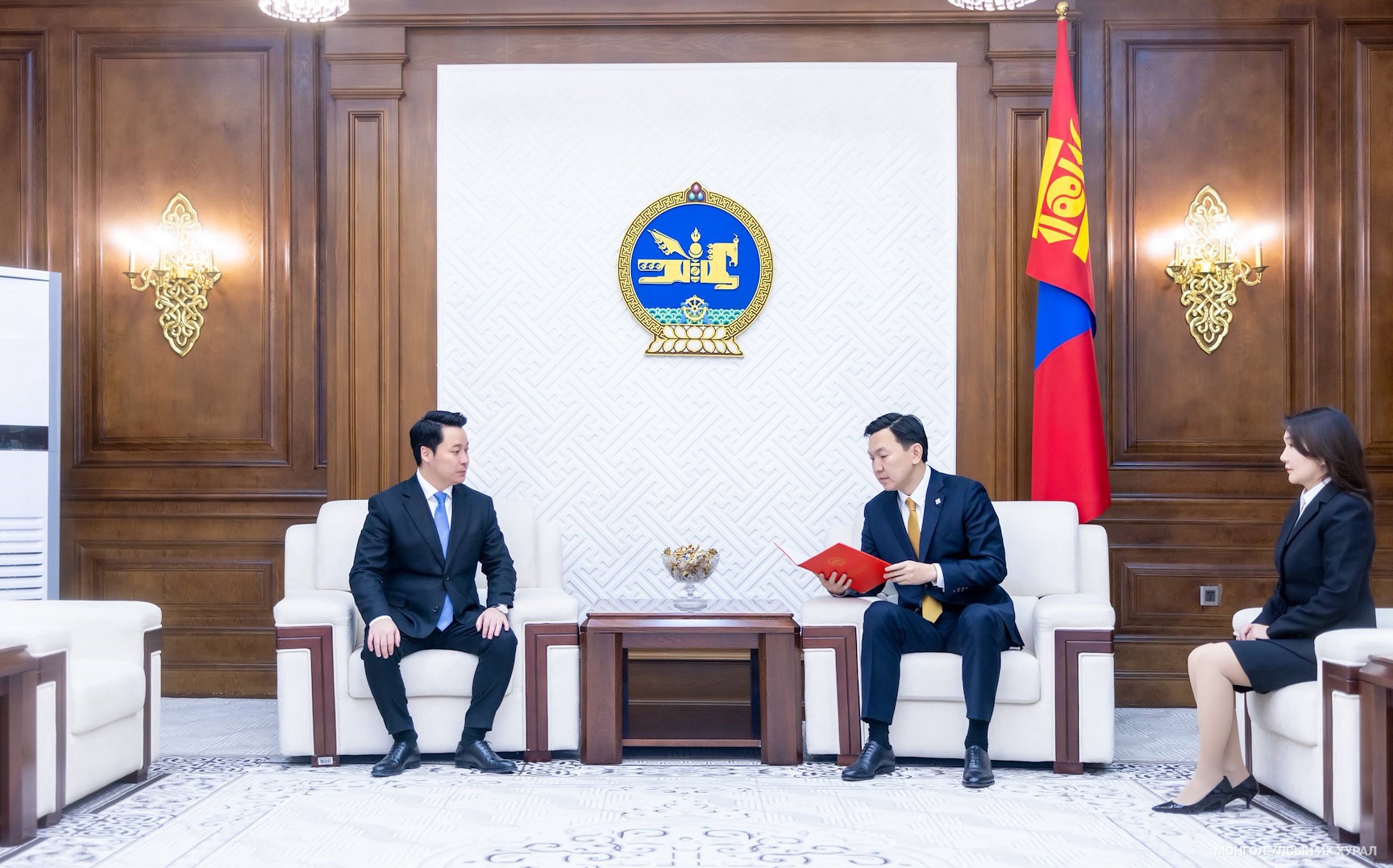 Монгол Улсын Их Хурлын дарга Н.Учралд Элчин сайд нарыг эгүүлэн татах, томилох талаарх Монгол Улсын Ерөнхийлөгчийн зөвшилцөх саналыг Ерөнхийлөгчийн Тамгын газрын дарга А.Үйлстөгөлдөр өргөн мэдүүллээ.