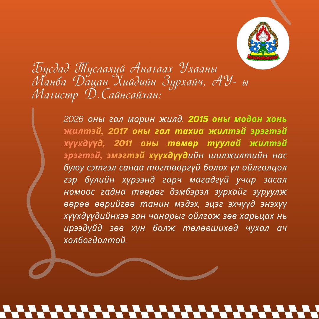 Жич: 2026 оны гал морин жилд: 2015 оны модон хонь жилтэй, 2017 оны гал тахиа жилтэй эрэгтэй хүүхдүүд, 2011 оны төмөр туулай жилтэй эрэгтэй, эмэгтэй хүүхдүүдийн шилжилтийн нас буюу сэтгэл санаа тогтворгүй болох үл ойлголцол гэр бүлийн хүрээнд гарч магадгүй учир засал номоос гадна төөрөг дэмбэрэл зурхайг зуруулж өөрөө өөрийгөө танин мэдэх, эцэг эхчүүд энэхүү хүүхдүүдийнхээ зан чанарыг ойлгож зөв харьцах нь ирээдүйд зөв хүн болж төлөвшихөд чухал ач холбогдолтойг анхаарна уу.