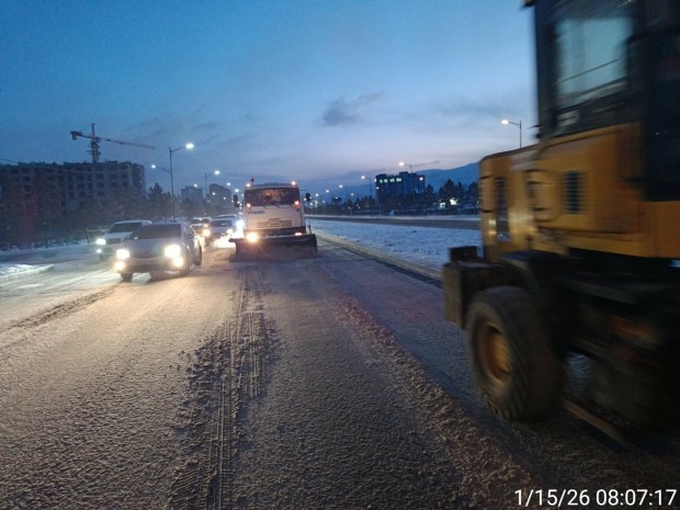 Гудамж, талбайн цас цэвэрлэхээр нийт 280 хүн, 54 техник, 84 бичил төхөөрөмжтэй ажиллаж байна. Зам талбайд 45 тонн давс, 84 тонн бодис цацсан бөгөөд 1149.5 тонн давс, 471.5 тонн бодис, 94 шоо метр дайргын нөөцтэй байна.