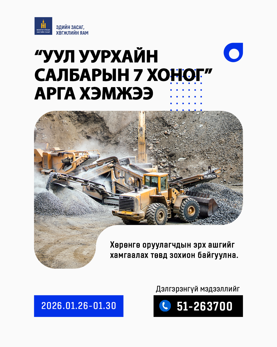 “Уул уурхайн салбарын 7 хоног” арга хэмжээ нь 2026 оны 1 дүгээр сарын 26-30-ний өдрүүдэд Засгийн газрын XI байрны 1 давхарт зохион байгуулагдах бөгөөд хөрөнгө оруулагчдын дуу хоолойг төрд шууд хүргэх, асуудлыг эрт шатанд шийдвэрлэх, уул уурхайн салбарт ил тод, тогтвортой, таатай хөрөнгө оруулалтын орчныг бүрдүүлэхэд чиглэнэ.