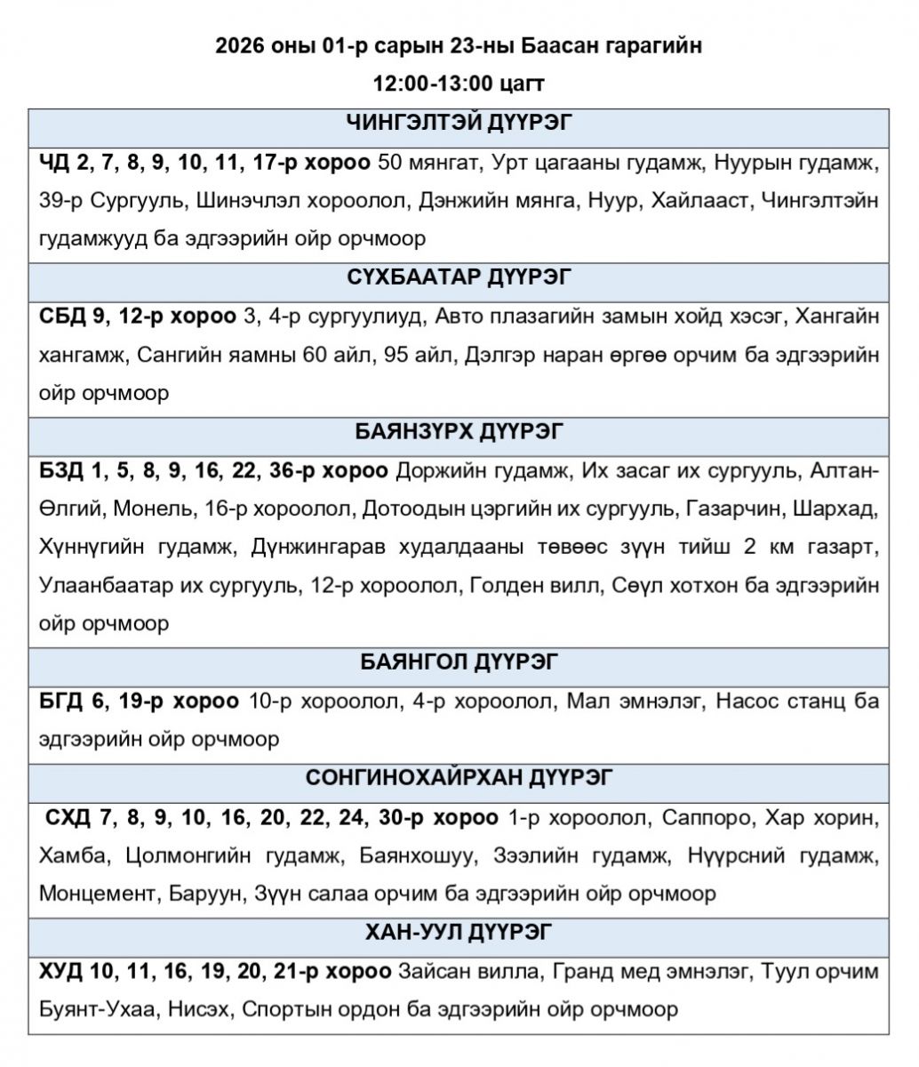 Эрчим хүчний чадлын дутагдлаас шалтгаалан 2026 оны 01-р сарын 23-ны Баасан гарагт цахилгаан эрчим хүчний “ХЯЗГААРЛАЛТ ХИЙЖ БОЛЗОШГҮЙ” байршлуудын хуваарь.
