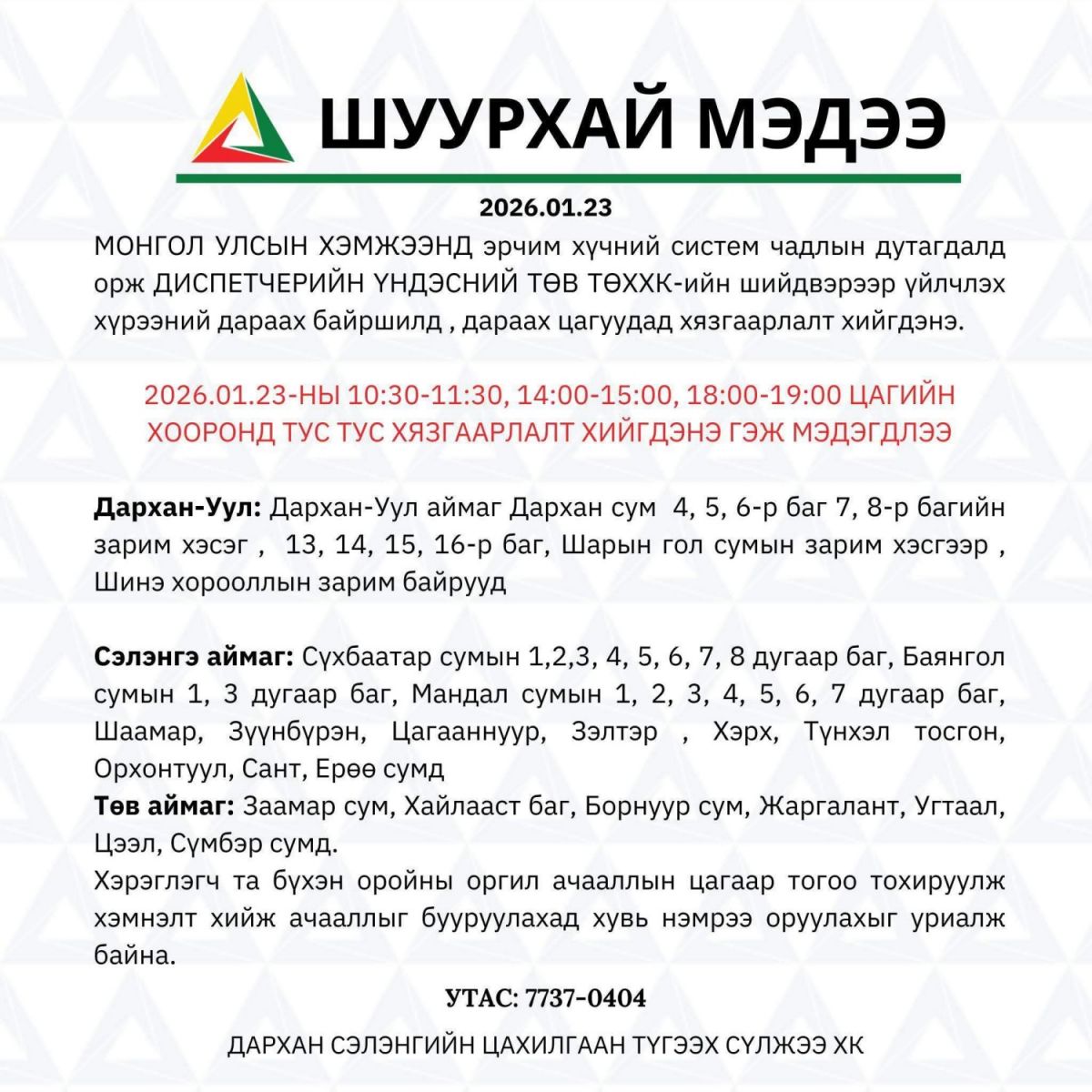 Сэлэнгэ, Дархан-Уул, Төв аймгийн хэмжээнд 2026.01.23-ны 10:30-19:00 цагийн хооронд цахилгаан хязгаарлана гэдгийг "Диспетчерийн Үндэсний Төв ТӨХХК"-иас мэдэгдлээ. Тодруулбал, Дархан-Уул, Сэлэнгэ, Төв аймгуудад цахилгаан хязгаарлана.