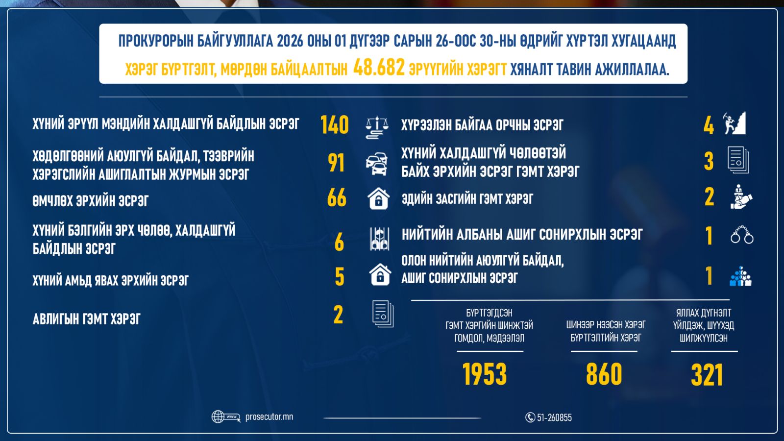 Прокурорын байгууллага 2026 оны 01 дүгээр сарын 26-ны өдрөөс 30-ны өдрийг хүртэлх хугацаанд хэрэг бүртгэлт, мөрдөн байцаалтын 48,682 эрүүгийн хэрэгт хяналт тавин ажиллажээ. Дээрх хугацаанд 1953 гэмт хэргийн шинжтэй гомдол, мэдээлэл бүртгэгдсэн бол хэрэг бүртгэлтийн 860 хэрэг шинээр нээж, 321 хэрэгт прокурор яллах дүгнэлт үйлдсэн байна.