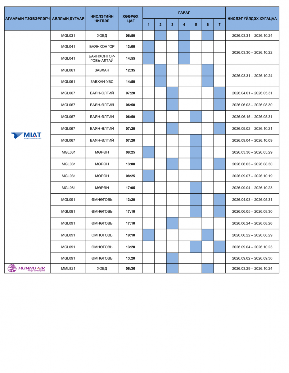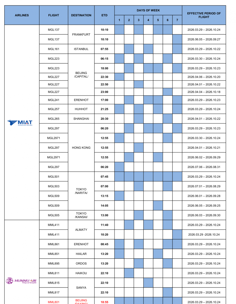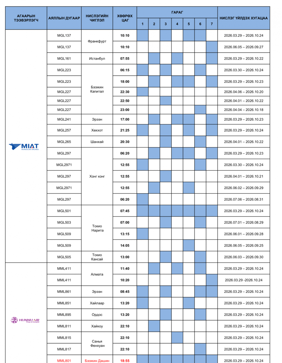 Иргэний нисэхийн ерөнхий газрын “Цагийн хуваарийн зөвлөл”-ийн 2025 оны III дугаар хурал 2025 оны 12 дугаар сарын 24-ний өдөр хуралдаж, гадаад болон дотоодын агаарын тээвэрлэгчдээс ирүүлсэн нислэгийн хүсэлтийг хэлэлцэн 2026 оны 3 дугаар сарын 29-ний өдрөөс 2026 оны 10 дугаар сарын 25-ны өдөр хүртэлх зуны улирын хуваарьт нислэгийн цагийн хуваарийг баталлаа.