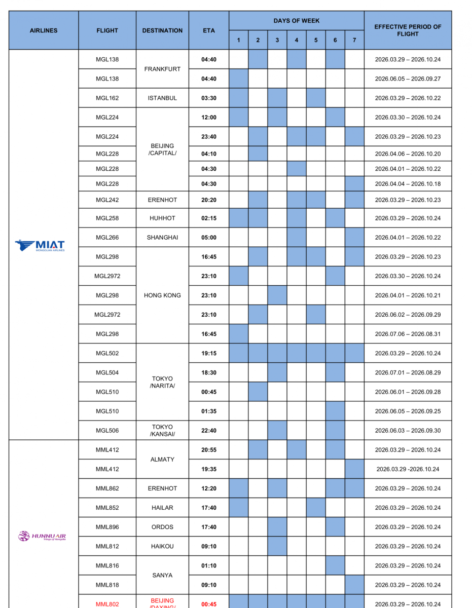 2026 оны олон улсын зуны хуваарьт нислэгт дотоод болон гадаадын нийт 17 агаарын тээвэрлэгч 22 чиглэлд 10905 нислэг үйлдэхээр төлөвлөгдсөн байна. Орон нутгийн агаарын шугамд “МИАТ” агаарын тээвэрлэгч 7 чиглэлд 1048, “Хүннү Эйр” агаарын тээрвэрлэгч 1 чиглэлд 120 нислэг үйлдэхээр төлөвлөгдсөн байна.