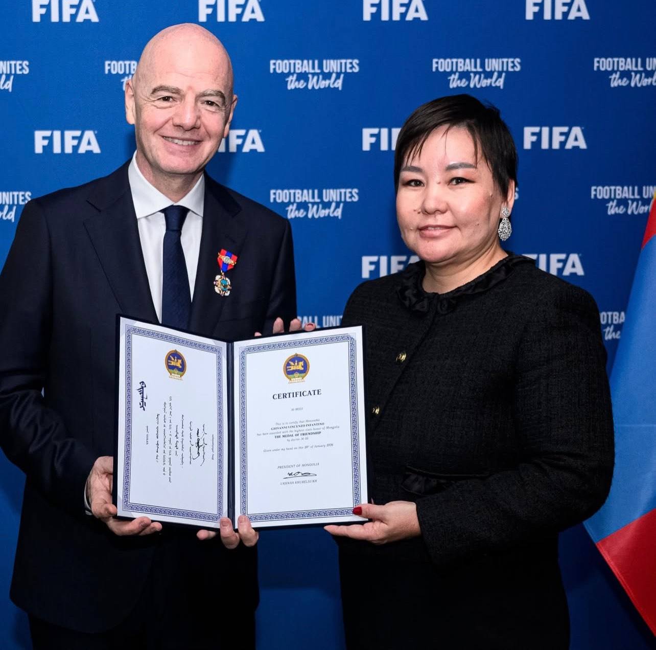 Олон улсын хөлбөмбөгийн холбооны ерөнхийлөгч Жианни Инфантино "Найрамдал" медалиар шагнуулжээ.