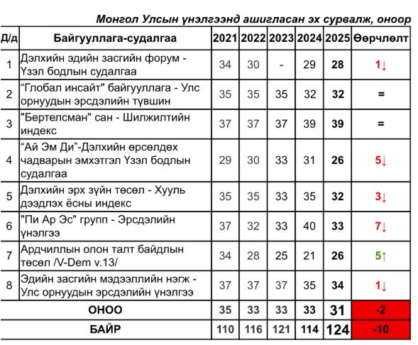 Энэ үзүүлэлтийг зөвхөн авлигын хэмжээ өссөн гэж тайлбарлаж болдоггүй. Тухайлбал эрхэм гишүүний дурдсан 2012 онд 36 оноотойгоор 94 дүгээр байрт, 2013 онд 38 оноотойгоор 83 дугаар байранд жагсаж байжээ. Ингээд 2025 онд 31 оноо авч, 182 улс орноос 124 дүгээр байранд эрэмбэлэгдлээ. Энэ нь 2024 оныхтой харьцуулбал, 2 оноогоор буурч, 10 байраар ухарсан.