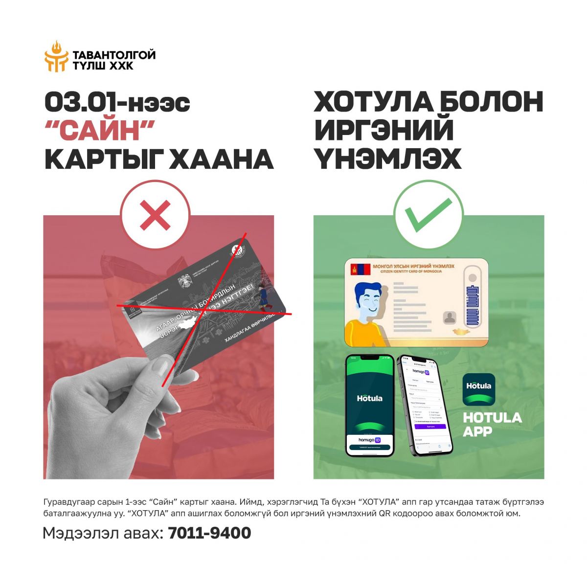 Нийслэлийн хэмжээнд сайжруулсан шахмал түлшний борлуулалтын ил тод байдал, хяналтын тогтолцоог сайжруулах хүрээнд 2026 оны 03 дугаар сарын 01-ний өдрөөс эхлэн "Сайн" карт ашиглахыг бүрэн зогсоож, түлш худалдан авахад зөвхөн ХОТУЛА аппликэйшн болон иргэний үнэмлэх ашиглахаар боллоо.