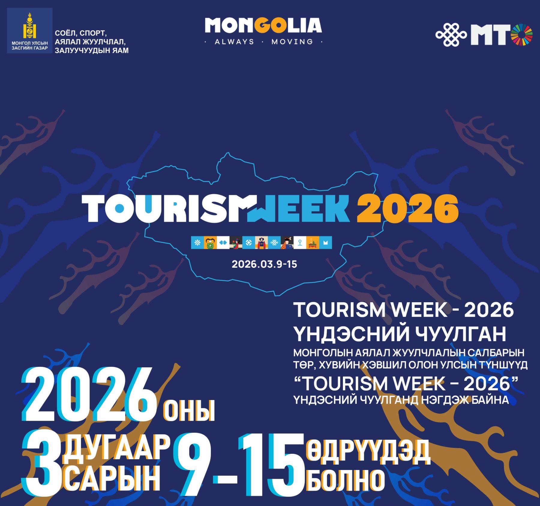 Соёл, спорт, аялал жуулчлал, залуучуудын яам, Аялал Жуулчлалын Мэргэжлийн Холбоо (Mongolia Tourism Organization) хамтран зохион байгуулж буй “Tourism Week–2026” арга хэмжээ 2026 оны гуравдугаар сарын 09-15-ны өдрүүдэд Улаанбаатар хотноо зохион байгуулагдана.