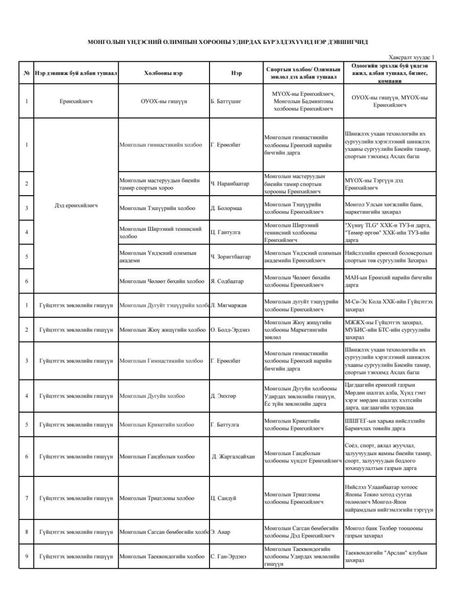 Монголын Үндэсний Олимпын Хорооны ээлжит чуулган (2026.03.12) зохион байгуулагдаж байна. Энэ удаагийн чуулганаар Удирдах зөвлөлд нэр дэвшигчид болон МҮОХ-ны ерөнхийлөгчийг сонгоно.