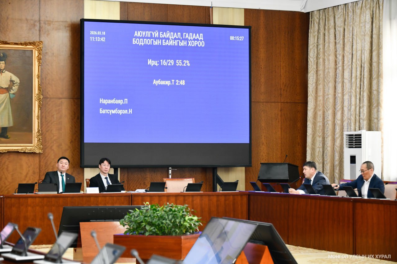 Улсын Их Хурлын Аюулгүй байдал, гадаад бодлогын байнгын хорооны өнөөдрийн (2026.03.18) хуралдаан 10 цаг 58 минутад эхэлж, Байнгын хорооны дарга Г.Тэмүүлэн Монгол Улсын Их Хурлын чуулганы хуралдааны дэгийн тухай хуулийн 7 дугаар зүйлийн 7.8 дахь хэсэгт заасны дагуу хуралдааны ирцийг нэрээр танилцуулав. Байнгын хорооны 29 гишүүний 51.7 хувь буюу Улсын Их Хурлын гишүүн О.Амгаланбаатар, Э.Бат-Амгалан, Н.Батсүмбэрэл, Д.Ганбат, Х.Жангабыл, С.Лүндэг, П.Наранбаяр, Г.Хосбаяр, Д.Цогтбаатар, Б.Энхбаяр, Ж.Энхбаяр, Л.Энхнасан, Д.Энхтүвшин, С.Эрдэнэболд нар хүрэлцэн ирснээр хуралдаан эхэлсэн юм.