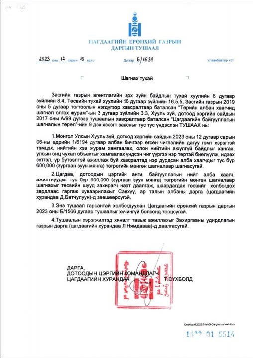 Цагдаагийн Ерөнхий газрын 2023 оны төсвийн жилийн цалингийн сангийн хэмнэлт болох 6.5 тэрбум төгрөгийг цагдаа, дотоодын цэргийн анги, байгууллагад улсын хэмжээнд ажиллаж буй мэргэжилтэн, жолооч, тогооч, үйлчлэгчээс эхлээд анхан шатны нэгжүүдийн нийт 10.971 албан хаагчдад тус бүр 600.000 төгрөгийг 13 дахь сарын цалингийн урамшуулал хэлбэрээр 2023 онд олгосон.