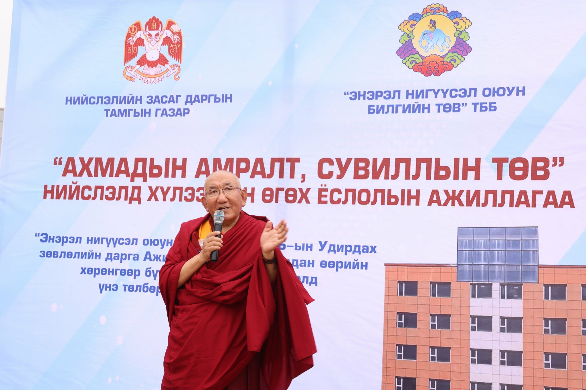 “Энэрэл нигүүсэл оюун билгийн төв” ТББ-ын тэргүүн Ажиа Гэгээн Лувсантүвдан “Ахмадуудад буян болохоор энэ өдөр өнжүүлэх төвийг барьсан. Өндөр өнжүүлэх төвдөө ахмадууд дасгал хөдөлгөөн хийж, эрүүл мэнддээ анхаарах боломжийг бий болгож байна. Үргэлжлүүлэн хашаанд нь мод, зүлэг тарьж, ногоон байгууламж хийнэ” гэв.