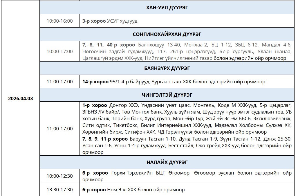 Өнөөдөр буюу дөрөвдүгээр сарын 03-ний өдөр цахилгаан шугам тоноглолд засвар үйлчилгээ хийх хуваарийг танилцуулж байна. Тодруулбал, Хан-Уул, Сонгинохайрхан, Чингэлтэй, Баянзүрх, Налайх дүүргүүдэд цагийн хуваарийн дагуу цахилгаан хязгаарлалт хийнэ.