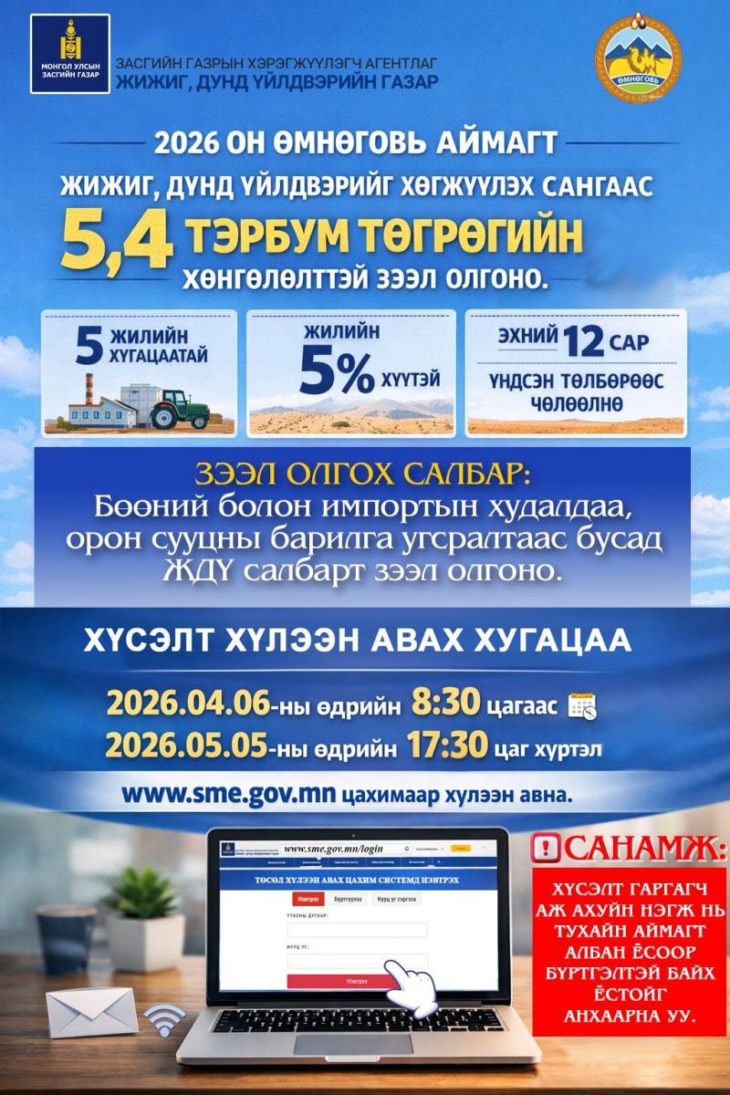 Үүний дагуу Засгийн газрын 2020 оны 113 дугаар тогтоолоор батлагдсан “Жижиг, дунд үйлдвэрийг хөгжүүлэх сангаас хөнгөлөлттэй зээл олгох, сонгон шалгаруулах, дамжуулан зээлдүүлэх, эргэн төлүүлэх, хяналт тавих журам”-ын дагуу бичил үйлдвэр, үйлчилгээ эрхлэгчийн зээлийн хүсэлтийг цахим хэлбэрээр www.sme.gov.mn-аар дамжуулан хүлээн авах үйл ажиллагаа эхэллээ.