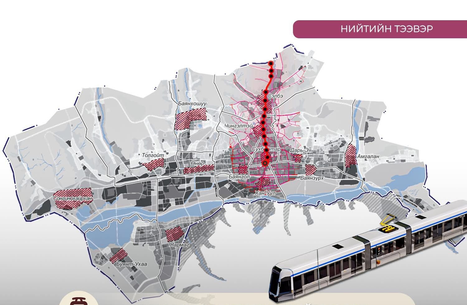 Нийслэлд трамвайн төслийг хоёр чиглэлд хэрэгжүүлэхээр төлөвлөсөн. Нэгдүгээр чиглэл нь Зунжингаас Сүхбаатарын талбай хүрэх бөгөөд 11 км урт, 16 зогсоолтой байна. Төслийг төр, хувийн хэвшлийн түншлэлээр хэрэгжүүлнэ.