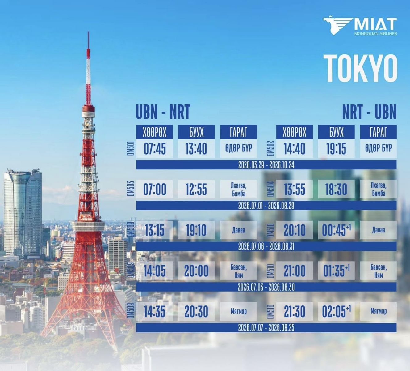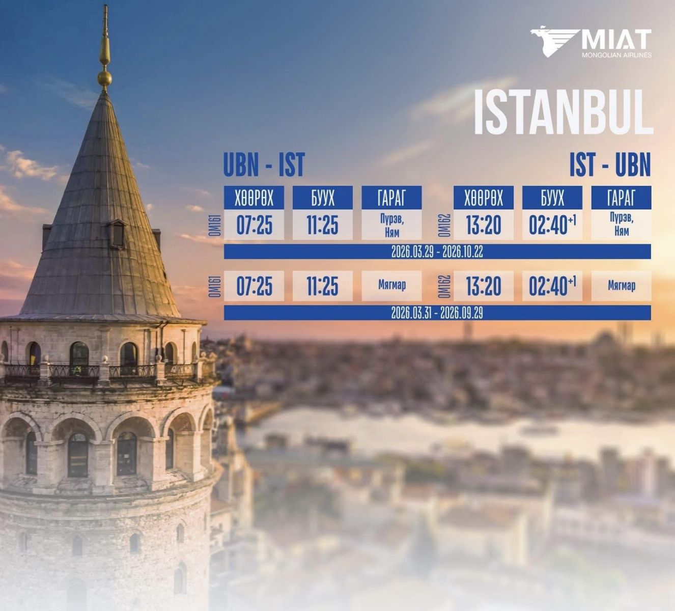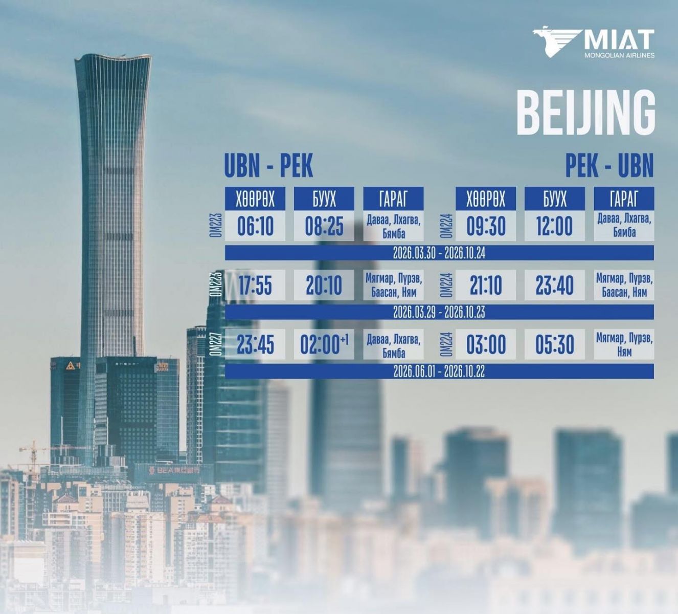 Монголын үндэсний агаарын тээвэрлэгч "МИАТ" ТӨХК-ийн 2026 оны олон улсын нислэгийн зуны цагийн хуваарийг танилцуулж байна