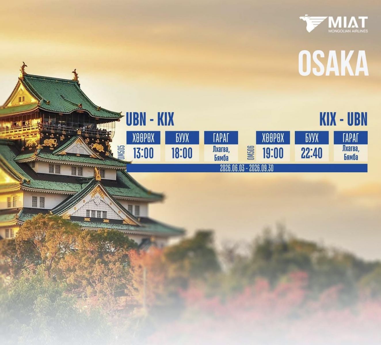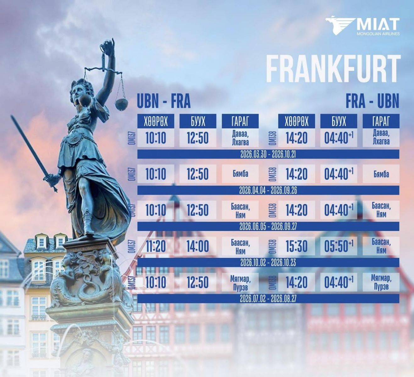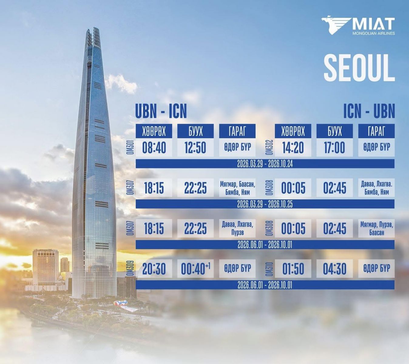 Монголын үндэсний агаарын тээвэрлэгч "МИАТ" ТӨХК-ийн 2026 оны олон улсын нислэгийн зуны цагийн хуваарийг танилцуулж байна