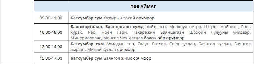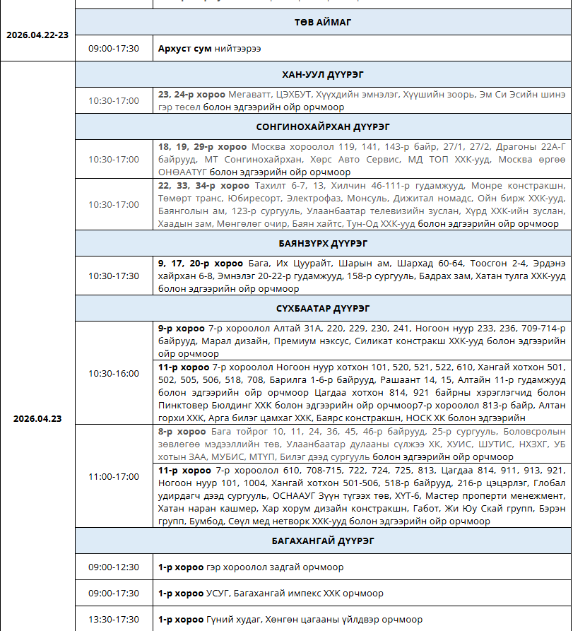 Өнөөдөр буюу дөрөвдүгээр сарын 23-ний өдөр цахилгаан шугам тоноглолд засвар үйлчилгээ хийх хуваарийг танилцуулж байна. Тодруулбал, Сонгинохайрхан, Баянхангай, Хан-Уул, Баянзүрх, Сүхбаатар дүүргүүдэд болон Төв аймгийн зарим сумдад цагийн хуваарийн дагуу цахилгаан хязгаарлана.