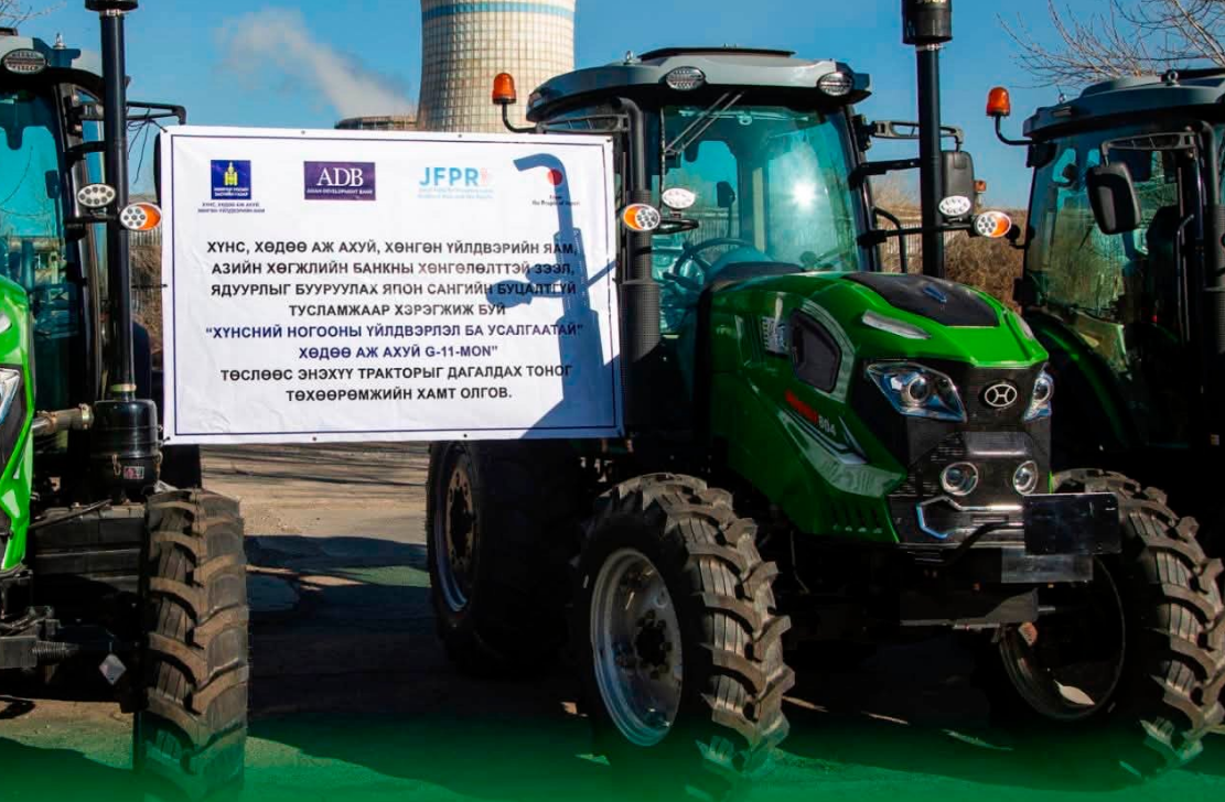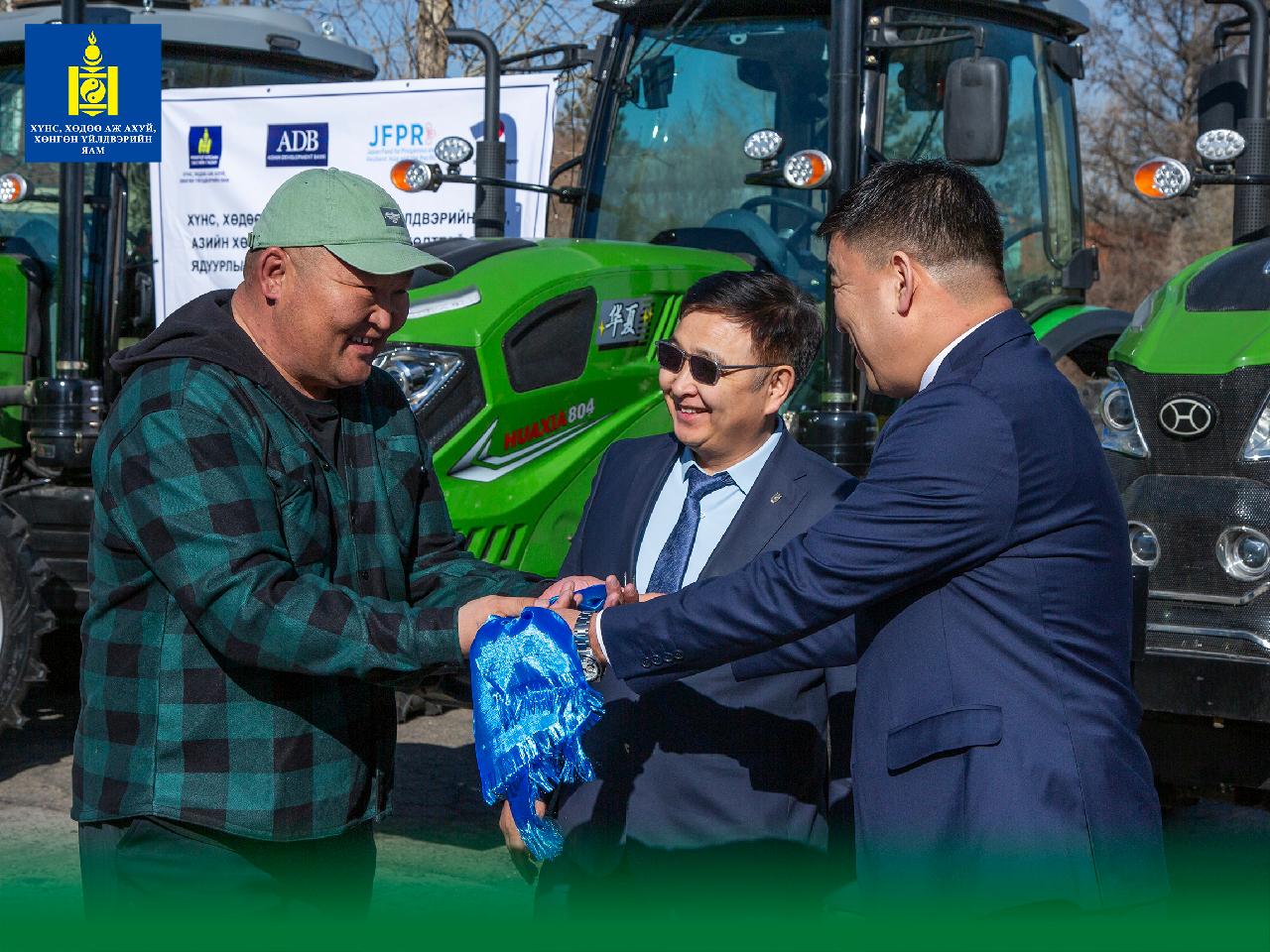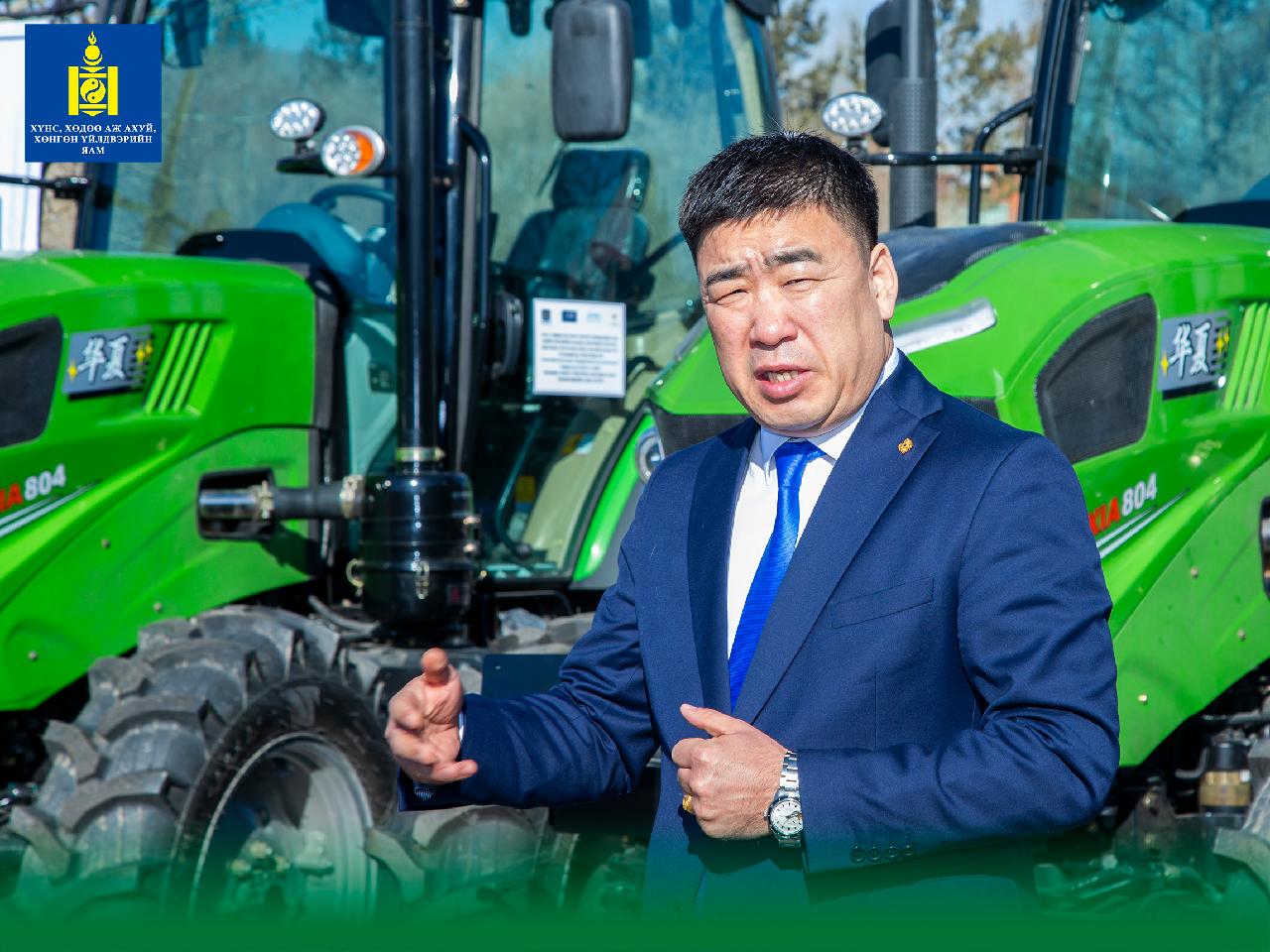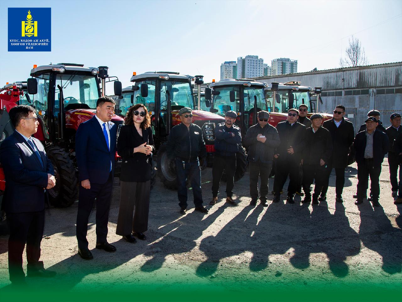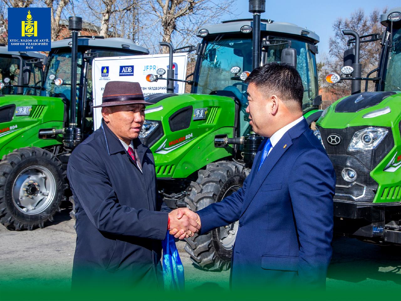 Хүнс, хөдөө аж ахуй, хөнгөн үйлдвэрийн сайд Ц.Идэрбат өнөөдөр "Хүнсний ногооны үйлдвэрлэл ба усалгаатай хөдөө аж ахуй G-11-MON" төслийн хүрээнд трактор, дагалдах хэрэгслийг төсөл хэрэгжиж буй сумдын удирдлага болон ногоочдод гардуулан өглөө.