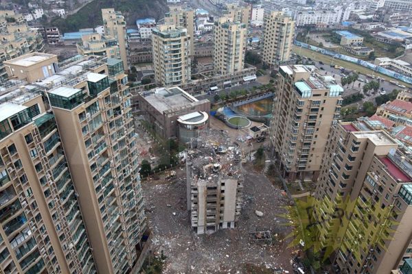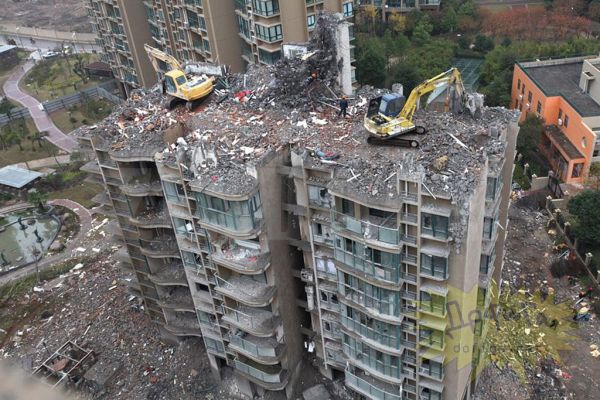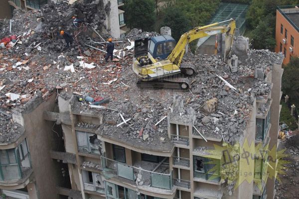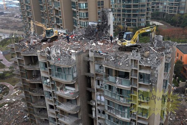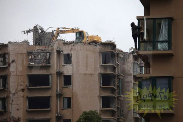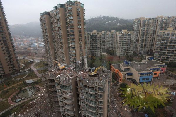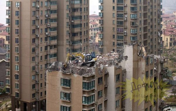 Дөнгөж баригдаад жил ч болоогүй байгаа барилгаа хятад барилгачид нураахаас өөр аргагүй болжээ. Байшинг дэлбэлж болохгүй байж. Дэргэдэх орон сууцны барилга хэт ойрхон тул. Ингээд арга сэтгэж дээвэр дээр нь хоёр бульдозер гарган нэг нэг давхараар нь нурааж эхэлжээ. Анхнаасаа хазайлттай барилгыг ингэж зайлуулахаас ч биш өөр яахав дээ...
