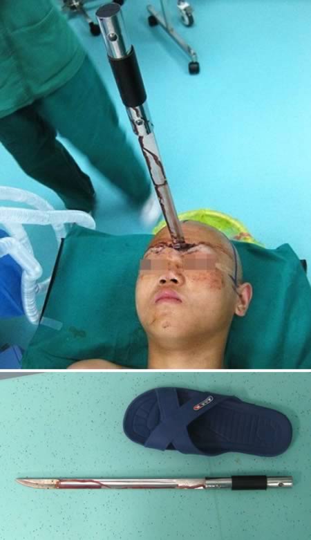 Зань Бин хэмээх 15 настай хүү жадаар хичээллэж байгаад хөмсөгний дунд хэсэгтээ санамсаргүйгээр зоожээ. 50 см урт энэхүү жад нь хүүгийн тархинд хүрээгүй өнгөц зоогдсон болохоор амьд гарсан байна. Зань хүү энэ талаараа: Ангийнхаа гурван хүүхэдтэй бэлтгэл хийж байсан. Тэгтэл гэнэт л толгой аймаар өвдөөд цус гарсан. Тэрнээс цаашаа юу болсныг санахгүй байна. Ангийнхан намайг 4 цаг яваад очдог Чаншагийн эмнэлэгт хүргэсэн байна лээ. Сүүлд нь толгойд зоогдсон жадаа харахад эвгүй санагдсан гэж ярьжээ.