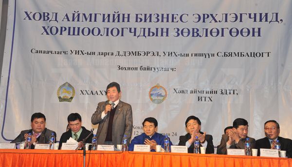 УИХ-ын дарга Д,Дэмбэрэл болон УИХ-ын гишүүн С.Бямбацогт нарын санаачлагаар Ховд аймгийн бизнес эрхлэгчид , хоршоологч нарын зөвлөгөөн энэ сарын 24-нд боллоо. Уг арга хэмжээнд ХХААХҮ-н сайд Т.Бадамжунай, Жижиг дунд үйлдвэрийн газрын дарга Ц.Ням-осор, Ховд аймгийн засаг дарга Г.Нямдаваа болон бусад албаны хүмүүсээс гадна аймгийн сум, багийн Засаг дарга нар, бизнес эрхлэгчид оролцлоо. ХХААХҮЯ-ны санхүүжилтээр Ховд аймгийн Засаг даргын Тамгын газартай хамтран зохион байгуулсан уг зөвлөгөөнд Ховд аймгийн бизнес эрхлэгчид, хоршоологчид идэвхтэй оролцон, өөрсдийн үйл ажиллагаанд бодитой үнэлэлт дүгнэлт өгч, тодорхой үр дүн гаргахын тулд дүн өвлийн хүйтэнг ажралгүй, цаг заваа гарган энд хүрэлцэн иржээ.