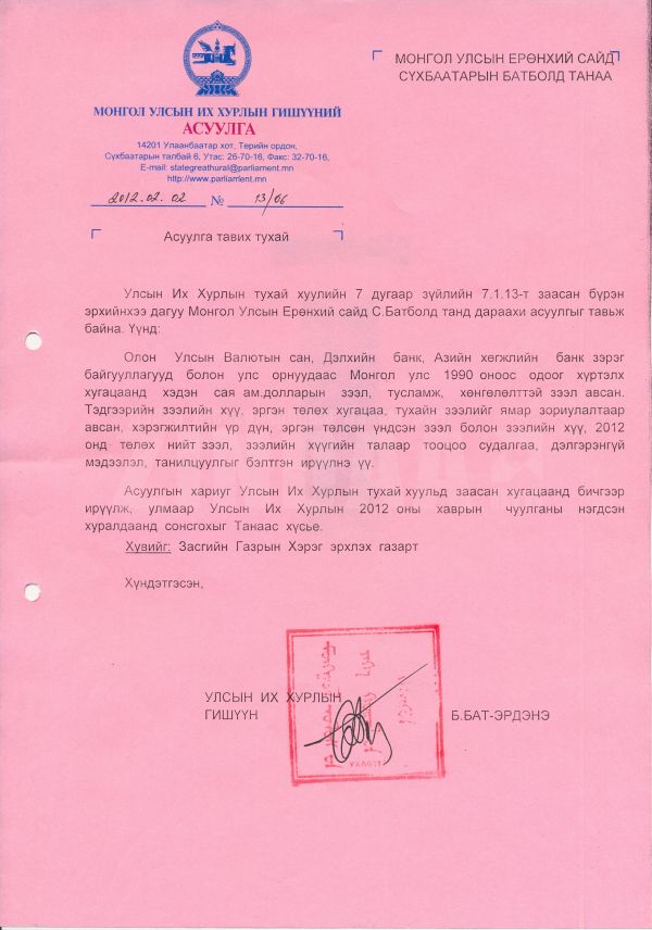 Асуулгын хариуг Улсын Их Хурлын тухай хуульд заасан хугацаанд бичгээр ирүүлж, улмаар Улсын Их Хурлын 2012 оны хаврын чуулганы нэгдсэн хуралдаанд сонсгохыг Танаас хүсье.