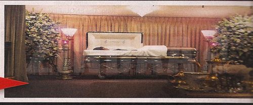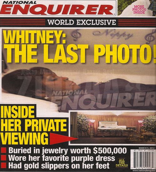 Зургийг талийгаачийн гэр бүлийн архиваас хулгайлсан эсвэл худалдаж авсан бололтой. National Enquirer сэтгүүл шинэ дугаартаа дэлхийн хэмжээний сенсааци болох зургийг нийтлээд байгаа нь энэ. Уитни ХЬЮСТОНЫ улаан модоор хийсэн авсан дахь сүүлчийн зураг... Төрөлх Ньюарк хотын Whigham хэмээх танхимд ойр дотныхны хүрээнд болсон оршуулгын ёслолын үеэр энэ кадрыг авсан байна. Дуучин бүсгүйн цогцос эгээтэй л унтаж байгаа мэт харагдах ажээ. Дуучин хатагтайг 500.000 доллар бүхий хамгийн хайртай үнэт эдлэлүүдээр нь “гоёжээ”. Хөлөнд нь алтан шаахай углуулсан гэнэ.