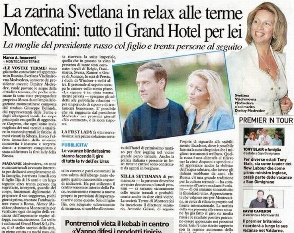 Энэ талаарх мэдээллийг хамгийн анх “avmalgin” блоггер Италиас бичжээ. Тэр цааш нь үргэлжлүүлэн: -Хоёр хоногийн өмнө миний амьдардаг газраас км-ийн зайд Монтекатини Термед орших Grand Hotel La Pace хэмээх таван одтой зочид буудалд 30 орчим хувийн хамгаалагчаар “зэвсэглэсэн” Светлана Владимировна Медведева ирж буулаа. Манай орны тэргүүн хатагтай. Хатагтай Медведева энэ буудал гэх харшийг энэ сарын 21-нийг хүртэл хөлсөлсөн гэнэ. Түүнийг Итали дахь ОХУ-ын элчин сайд Мешков “хүргэж ирлээ”. Ингэхдээ хэд хоногийн өмнө элчин сайд өөрийн биеэр энд ирж бүх деталийг нэгд нэгэнгүй шалган, рестораны менютэй танилцан энгийн зочдыг үтэр түргэн гаргаж байшинг бүрэн чөлөөлөх даалгавар өгөөд явсан байна. Эндхийн орон нутгийн хэвлэлд “Их гүрний хатан эх заларлаа” хэмээн бичиж эхэллээ. Хатан хаан мэтээр өөрийгөө төсөөлөөд байгаа Медведева энд хэдэн өдрийн турш рашаан зооглож, биеийн тэнхээгээ сайжруулахаар ирсэн гэсэн. Манай энэ хотын дарга тэр даруй хатагтайд бараалхахаар очсон чинь бараг усанд орж байна гэх ухааны юм яриад хүлээж аваагүй байна. Арай ч дээ... Энэ тансаг амралтынх нь төгсгөлд Ерөнхийлөгч өөрийн биеэр эхнэр дээрээ ирэх сурагтай. Харин одоогоор эндхийнхэн эгээтэй тэртээ цагийн их Орос гүрний хатан хаан Элизавета ирсэн адил л хөл алдаж үхэлдэцгээж байна.