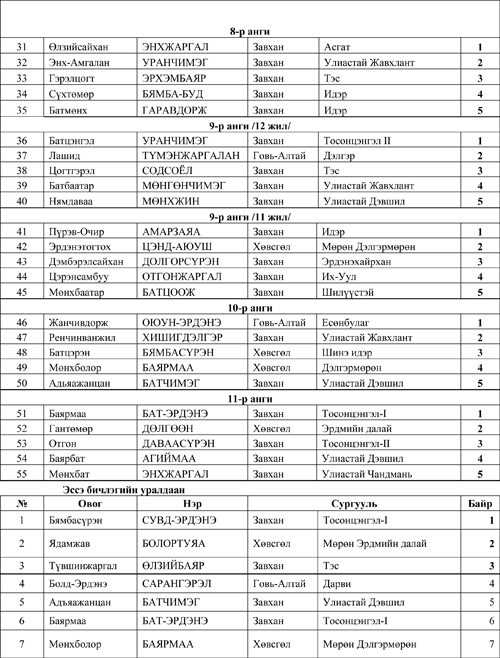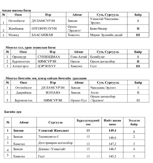 Их уулсынхаа салхинд хийморь лундаагаа сэргээсэн харчуул сумын төвийн улаан буланд ирж мэдлэг боловсрол, авьяасаараа тодорсон багш сурагчдад шагналыг нь гардуулсан юм. Хамгийн гол шагнал болох мэргэжлийн багш нарын төрөлд тэргүүн байрыг Говь-Алтай аймгийн Есөнбулаг сумын багш О.Сүнжидмаа тодров. Тэрээр улсын уралдаанд мөн тэргүүлжээ. Аварга бол аваргаараа л байдаг ажээ. Түүнийг шалгаруулж буй эрхэм докторуудын үнэлгээ мөн ижил байдаг ажээ. Сүнжидмаа багшид нэг сая төгрөг, алтан цом, “Багш дор мөргөмү” хэмээх цул эрдэнийн тэмдгийг боловсролыг дэмжигч “Лхагважав сан”-гийн тэргүүн гардуулсан. Түүний ард Орхон аймгийн Бүрэнтогтохын Нямсүрэн, Хөвсгөлийн Галтын Алтангэрэлийн Цэрэнхүү нарын багш нар цулбуурдуулж, өндөр шагналын эзэд боллоо. Мэргэжлийн багш нарын тэргүүн шагналын санг ирэх жилээс нэг сая бус арван саяд ч хүргэх бодол байна гэж Л.Төрбаяр захирал хэлэхүйд уухайлсан олны дуу, хөөр баяр улаан булангийн дээврийг зад татах дөхсөн шүү. Ийнхүү баяр бахдалаар халгиж, билэг оюунаар жигүүрлэн, номын гэгээ гэрэл, их уулсын сүр хүчинд алгадуулан хэдэн өдрийг Идэрийнхээ хөвөөнд өнгөрүүллээ. Салхи нь зуу зуун жилээр тарнийн шидийг оршоосон билэг төгөлдөр нутагт улирлын сайханд ирээд буцахуйд нас хэдэн жилээр уртсах хувийг олдог билээ л.