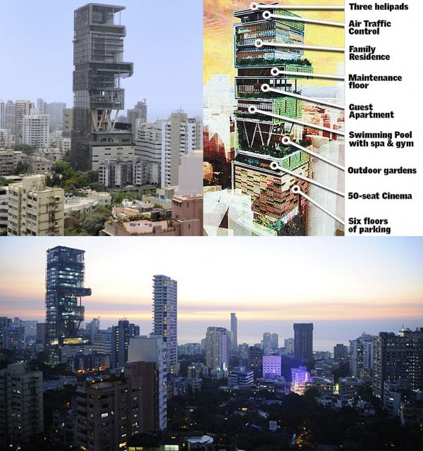53 настай энэтхэгийн тэрбумтан Мукеш Амбани (Mukesh Ambani) нь дэлхийд хөрөнгөөрөө дөрөвт бичигддэг. Тэрээр хүүхэд насны мөрөөдлөө биелүүлжээ. Мумбаи түүний хувийн байшин бүрэн баригдаж дуусчээ. Энэ нь дэлхийн хамгийн өндөр хувийн орон сууцад тооцогдож байгаа билээ. Нэр нь Antilia.-_ давхар энэ байшинд 160 машины гараж, автосервис, бэлтгэлий заал, цэцэрлэгт хүрээлэн, бага хэмжээний кино театр, усан сан, хүлээн авалтын танхим, нисдэг тэрэг буух талбай мөн гэр бүлийн өрөө тасалгаа бий. Тэрээр өдгөө 14 давхарт нь амьдардаг бөгөөд нээлтийнх нь баярт энэтхэгийн ерөнхий сайд Манмохан Сингх уригдан оролцжээ. Нийт 77 саяын төсвөөр барьжээ. Харин Мумбаин зах зээлд энэ байшин нэг тэрбумд хүрнэ хэмээн эзэн нь мэдэгджээ.