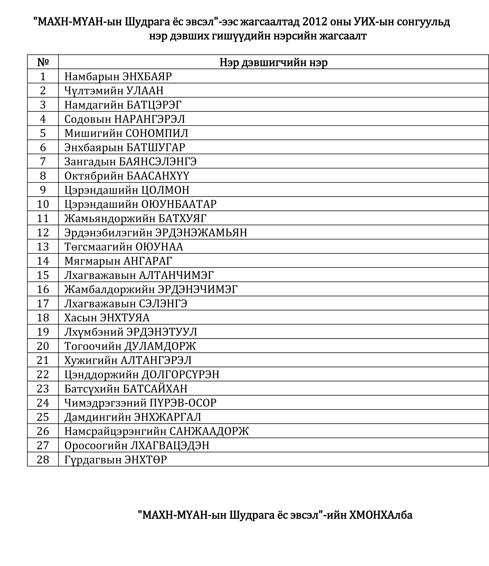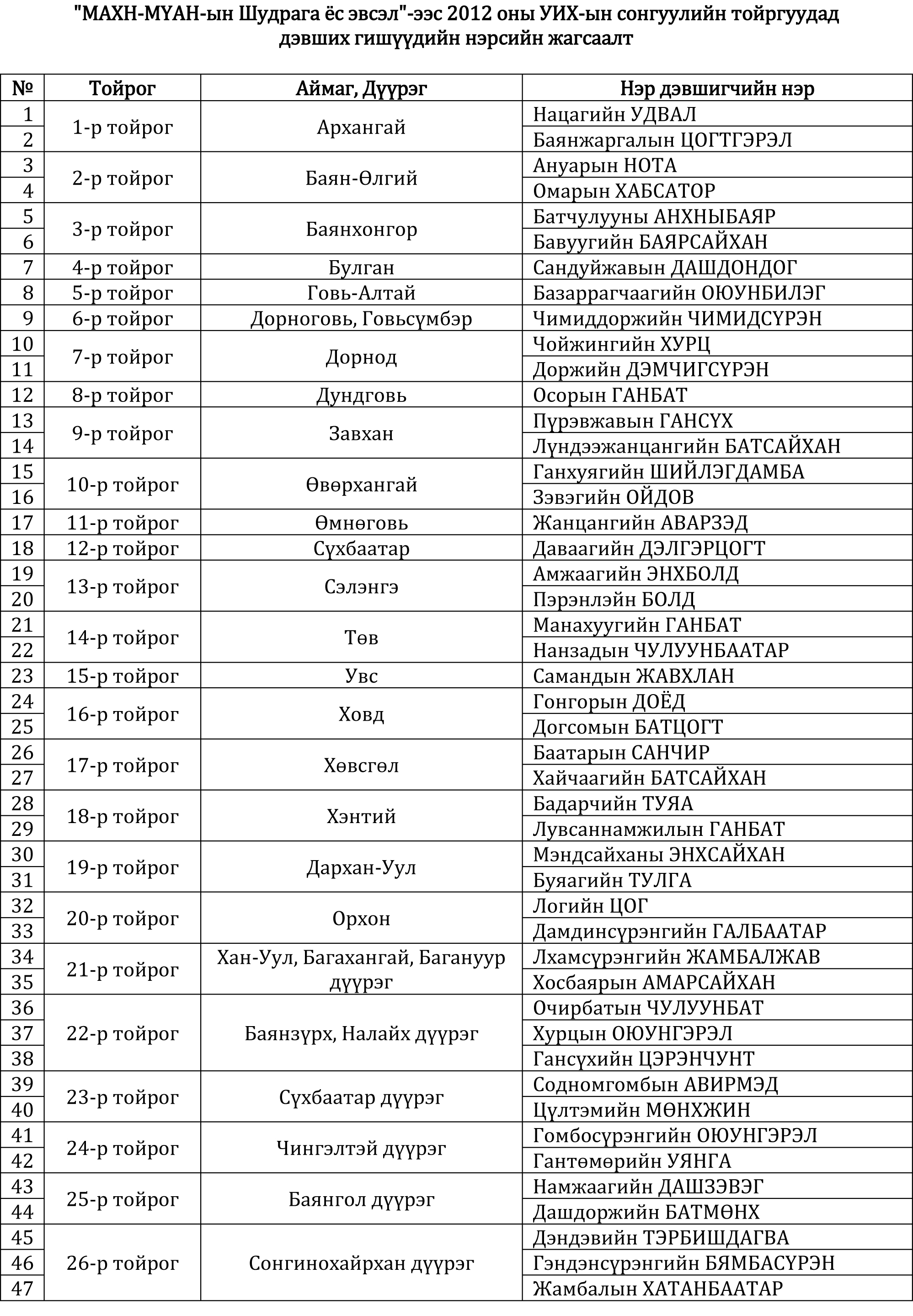 Дөнгөж сая ”МАХН-МҮАН-ын Шударга ёс эвсэл”-ээс 2012 оны УИХ-ын сонгуулийн тойргуудад дэвших гишүүдийн нэрсийн жагсаалтыг эцсийн байдлаар гаргажээ.