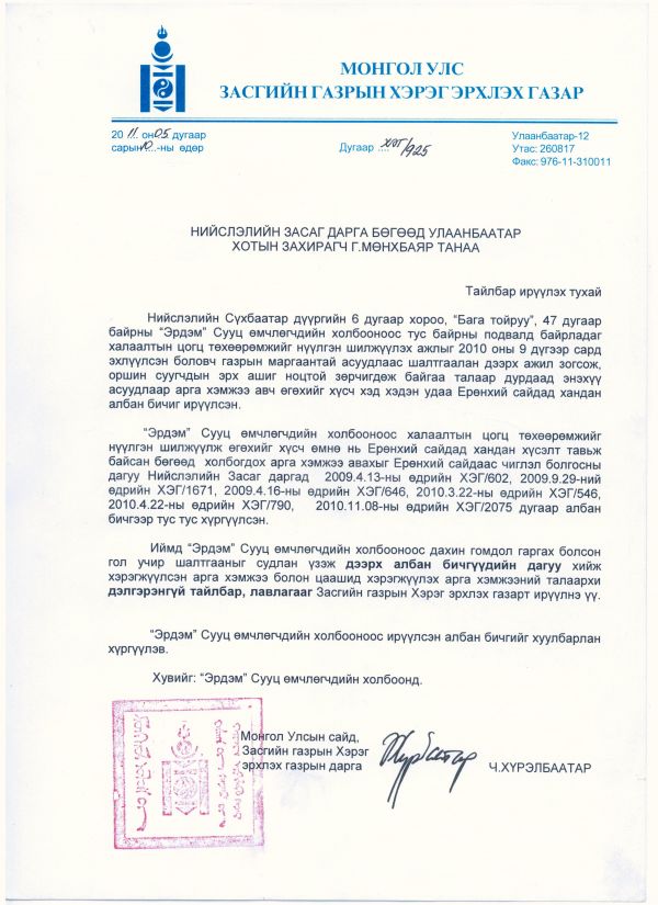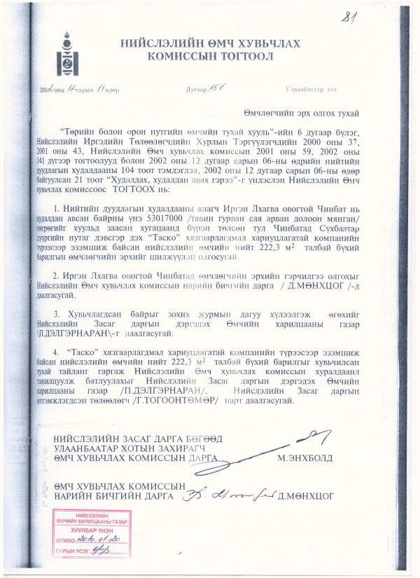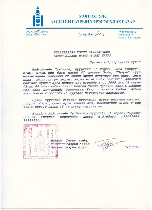 Иймд иргэд Нийслэлийн захиргааны хэргийн шүүхэд гомдол гаргажээ. Үүний дагуу Нийслэлийн захиргааны хэргийн шүүхийн 2010 оны 48 тоот шийдвэрээр “Ус дулаан дамжуулах төв”-ийн барилгыг барихаар шийдвэрлэсэн. Гэтэл иргэн Л.Чинбат хууль бусаар барилгын ажлыг зогсоож оронд нь ямар ч зураг төсөл, зөвшөөрөлгүй барилга барьж эхэлсэн гэнэ. Энэ байдлыг шийдвэр гүйцэтгэгч Ц.Чинтуяад удаа дараа ханджээ. Гэвч уг шүүхийн тогтоолыг одоо болтол хэрэгжүүлэхгүй байгаа учир дахин шүүхэд гомдол гаргаж, шүүхийн шийдвэрийг хэрэгжүүлэхээр тэмцэнэ гэдгээ илэрхийлсэн юм.