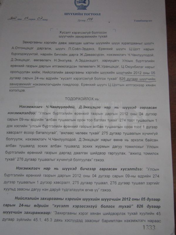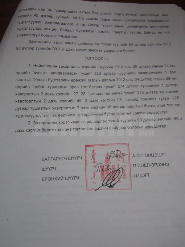 Харин шүүхээс энэ сарын 6-нд Д.Энхцэцэг, Ч.Чанлуулодой нарыг ажлаас халсан нь хууль бус болохыг тогтоож, буцаан албан тушаалд нь томилохыг үүрэг болгожээ. Гэтэл Л.Амарсанаа шүүхийн энэ шийдвэрийг биелүүлэхээс татгалзсан. Энэхүү тогтоол нь давж заалдах боломжгүй эцсийн шийдвэр гэдгийг шүүхийн тогтоолд дурдсан ч Л.Амарсанаа дарга одоо хүртэл ямар нэгэн арга хэмжээ авсангүй гэж нэхэмжлэгчид хэлсэн юм.
