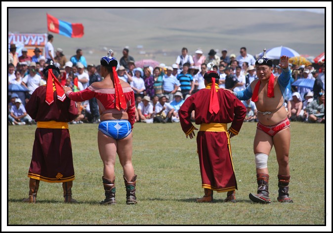 Өвөөгийн азарга түрүүлсэнийг хэлэх үү өөрийн эрхгүй догдлоод сумын асарт очоод, суналзтал дэвмээр санагдаад явчихав. Асарын зүгээс бөхийн бүртгэл дууслаа гэх чимээ цагаан хоолойгоор цангинах нь яараарай гэсний дохио байв. Давхиж очоод уяан дээр морио уяаад бөх тайлбарлагч Жамъян багш дээр яваад очтол -За нэг хүнтэй тааруулчихъя дээлээ тайлаад бүсээ элгээрээ сайн бүслээд гараад ир гэдэг юм байна. Тун удалгүй бөх эхэлж Аймгийн арслан Хайдавтай оноолт таарч барилдлаа. Барилдах ч гэж дээ. Над шиг жаалыг тэр том бөх ганцхан гараараа татаад тасхийтэл гуядаж чулуудлаа. Үзэгч түмэн шуугиад л чих дүнгэнээд явчихлаа. Ганцхан угз татаж босгоод арслан толгой дээгүүр гараа өргөөд намилзах туг өөд маажигнан гүйлээ. Бөхийн асарт суух сумын засаг дарга тавагтай боорцогноос надад атгаж өгөөд ирэх жил сайн барилдаарай миний хүү гэж хэлээд урам өгч билээ.