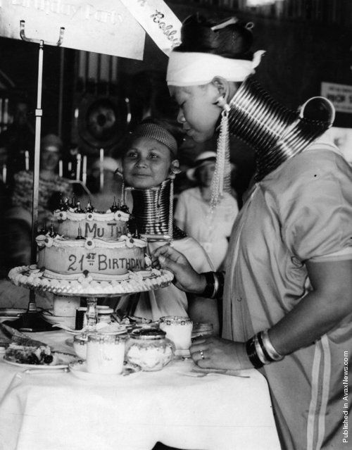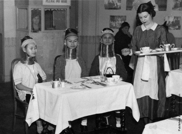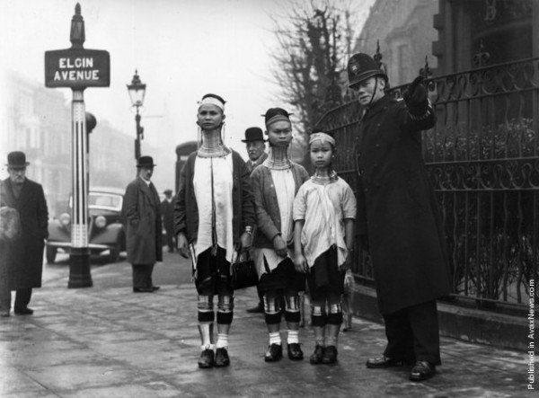 Лондонгийн Elgin Avenue-д цагдаагийн ажилтан Бирмээс ирсэн гурван бүсгүйд зам зааж өгч байгаа нь. 1935 онд энэ ховор гэрэл зургийг General Photographic Agency / Getty Images авсан байна. Хүзүүндээ олон тооний төмөр цагирага зүүн гангарсан падаунг омгийн бүсгүйчүүд нэгнийхээ 21 насны төрсөн өдрийг тэмдэглэж байжээ. Тэдгээр Bertram Mills Circus хэмээх циркийн жүжигчид байсан гэнэ.