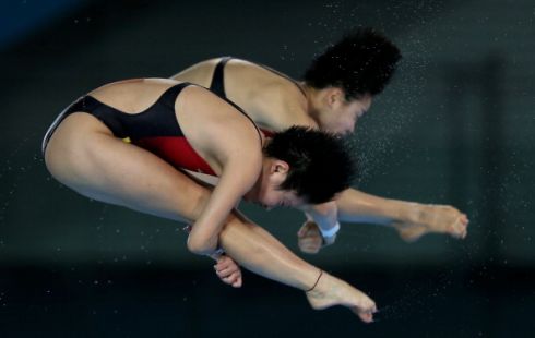 Эмэгтэйчүүдийн 10м-ийн синхрон үсрэлтэд БНХАУ-ын Чен Руолин, Ван Хао нар 386.40 оноогоор тэргүүлж алтан медаль хүртжээ. Энэ төрөл олимпийн хөтөлбөрт орсноос хойш буюу сүүлийн 3 олимпод тэргүүлсэн Хятадын бүсгүйчүүд энэ удаад ч аварга цолоо хамгаалж, дөрөв дэх удаагаа алтан медаль өвөртлөв.
