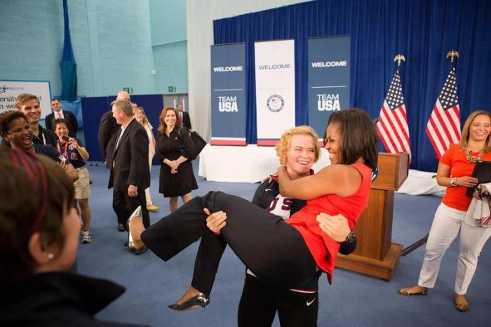 Английн Лондон хотод Зуны олимпийн наадмын нээлтийн ажиллагаанд оролцсон АНУ-ын тэргүүн хатагтай Мишель Обама олимпийн тосгонд зочилж тамирчидтайгаа уулзаж байх үеэр чөлөөт бөхийн 63 кг-ын жингийн тамирчин Елена Пирожкова түүнийг өргөхийг хүсэж зөвшөөрөл аван “дүрсгүйтжээ.” Тэргүүн хатагтай Мишель Обама ная гаруй кг-ын жинтэй эмэгтэй ажээ.