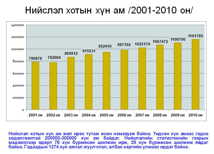 Нийслэл хотын хүн ам жил ирэх тутам өсөн нэмэгдэж байна. Үндсэн хүн амаас гадна хөдөлгөөнтэй 200,000-300,000 хүн ам байдаг. Нийслэлийн статистикийн газрын мэдээллээр өдөрт 78 хүн бүрмөсөн шилжин ирж, 29 хүн бүрмөсөн шилжиж явдаг байна. Гадаадын 1274 хүн аялал жуулчлал, албан хэргийн улмаас ирдэг байна.