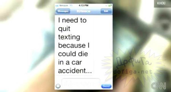 Энэ бол Техас мужийн Хьюстон хотын иргэн 21 настай Чанс Боте гэх залуу юм. Түүний машинтайгаа давхиж явахад нь ачааны тэргэн мөргөн замын хажуу руу шиджээ. Харин тэрээр осолд орохын өмнөхөн бичсэн нэгэн мессежийг цагдаагийнхан гар утаснаас нь илрүүлжээ. Түүнд нь :-Би мессеж бичихээ болихгүй бол болохгүй нь ээ. Жолоо барьж байхдаа ингэж болохгүй. Үгүй бол осолд орж үхэж ч мэднэ хэмээн бичсэн байв. Гэхдээ тэр аймшигт ослын дараа залуу амьд гарсан ч зургаан сар эмнэлэгт хэвтжээ. Тархиндаа хэд хэдэн удаагийн мэс засал хийлгэсэн түүний бие одоо ч хэвийн биш байгаа гэжээ.